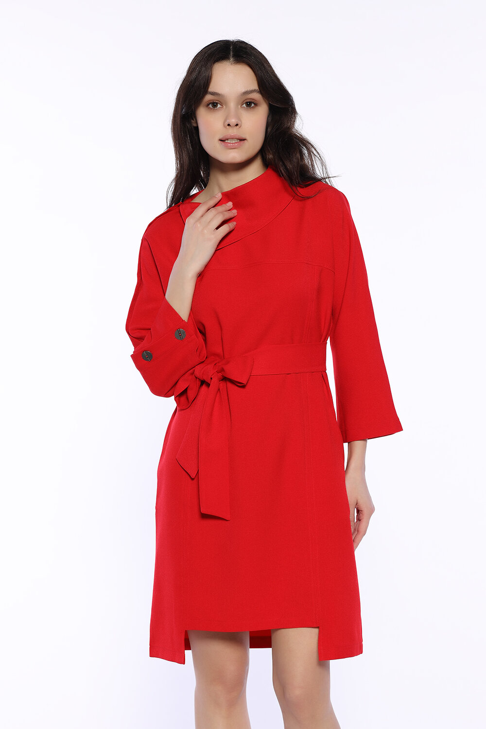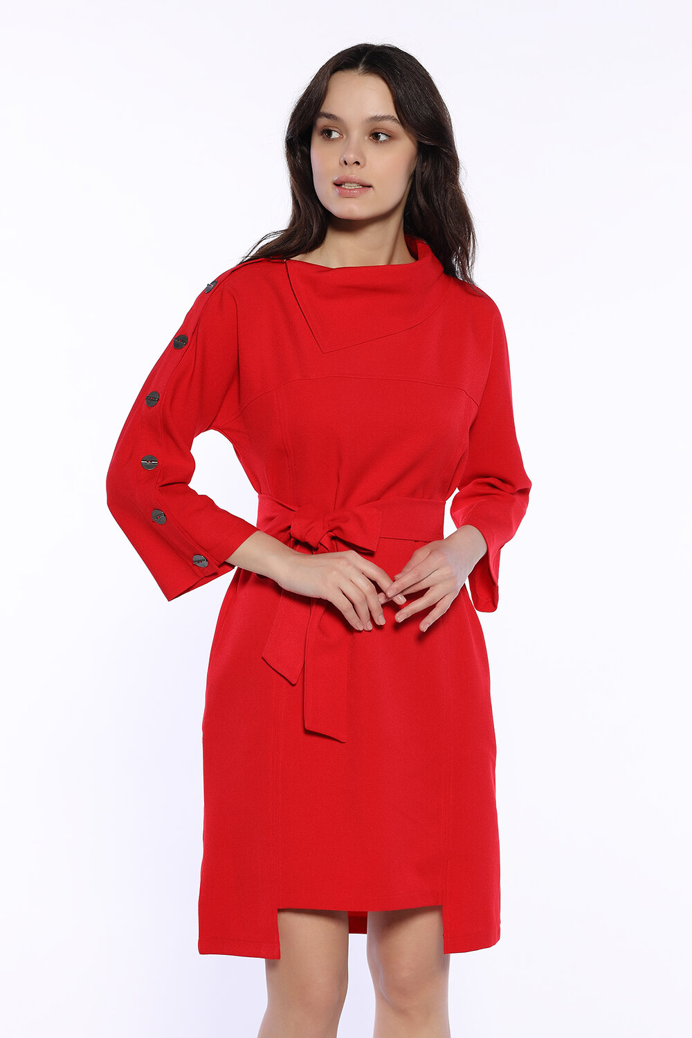 Праздничное платье миди с интересными декоративными деталями создаст неповторимый образ для праздника, торжественного случая или на каждый день. Стильное офисное платье имеет вырез горловины лодочка и эффектный фантазийный воротник. Свободные рукава три четверти ниже локтя декорированы пуговицами с одной стороны и не стесняют движений. Платье выше колена комплектуется длинным поясом в цвет платья, выгодно выделяя талию и создавая женственный силуэт. Платье имеет асимметричную длину (спереди квадратный вырез выше колена), визуально вытягивает фигуру. Для удобства современных девушек шикарное нарядное платье дополнено практичными боковыми карманами. Лаконичный приталенный полуприлегающий крой идеально сядет на любую фигуру и скроет ее возможные недостатки. Платье выполнено из приятной плотной ткани и идеально подойдет для весны, осени, зимы. Универсальное платье впишется в гардероб как взрослой женщины, так и молодой девушки.