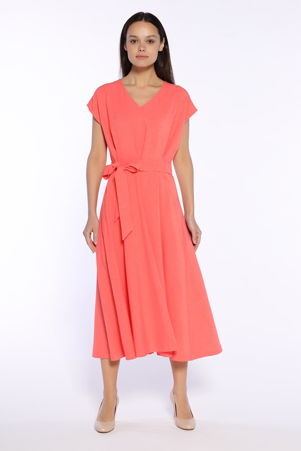 Платье миди с поясом. Если Вы ищете элегантное летнее платье на выход или на работу, обратите внимание на платье миди с акцентным поясом. Деликатный V-образный вырез приоткрывает ключицу, а струящаяся ткань платья будет притягивать взгляды к Вашей походке. На платье миди предусмотрены удобные втачные карманы. V-образный вырез. Без отделки горловины. Рукава короткие. Рукава цельнокроеные. Комплектация пояс. Вид застежки молния. Декоративные элементы складки, карманы. Карманы втачные. Длина миди. Крой приталенный. Рекомендована стирка при температуре не более 30С. Приталенное платье миди с комплектным поясом поможет создать нужное настроение на торжественном мероприятии или на романтической встрече. Завершите утонченный образ обувью на каблуке, небольшой сумочкой на тонком ремешке и лаконичными украшениями.