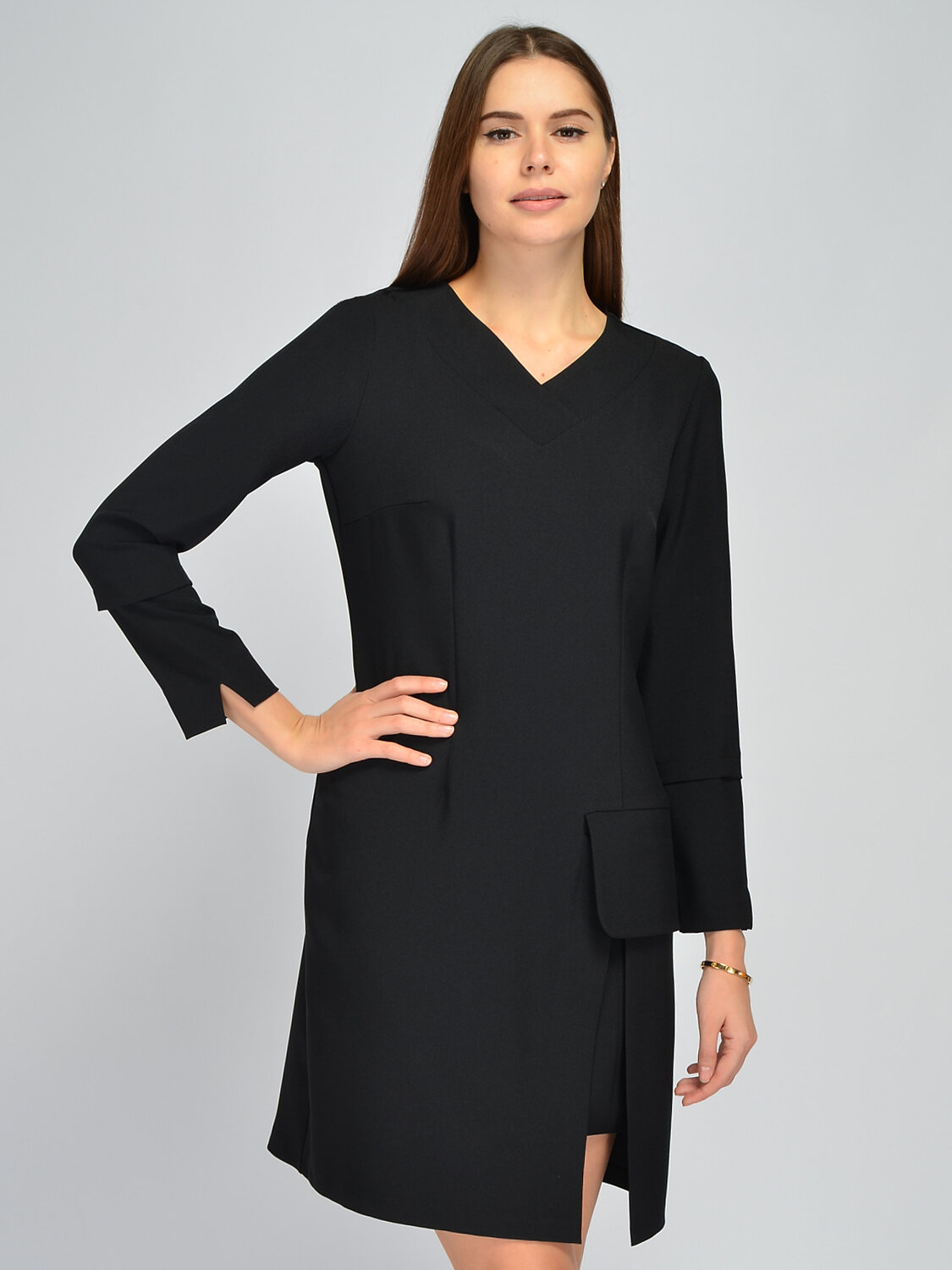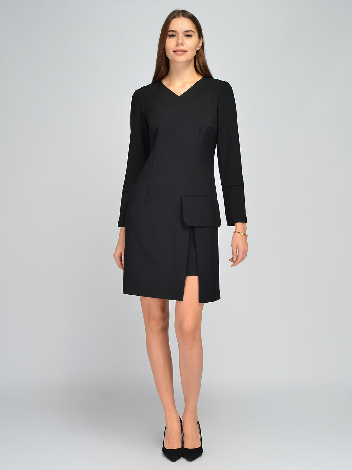 Нарядное платье мини станет ярким элементом Вашего гардероба. V-образный вырез горловины элегантно обрамляет шею и позволяет дополнить образ коротким шейным украшением. Приталенный свободный крой не облегает фигуру и поможет скрыть лишние сантиметры в области живота и бедер. Чтобы модель идеально села на любую фигуру, предусмотрены вытачки в области груди. Длинные свободные рукава не сковывают движений. На рукавах находятся небольшие разрезы. На передней части платья находится крупный клапан с глубоким карманом. Для того, чтобы подчеркнуть Вашу женственность и длину ног спереди у платья высокий разрез. Кроме того, он обеспечит удобство при ходьбе. Застегивается изделие на потайную молнию на спинке. Стильное платье мини подойдет и взрослым женщинам, и молодым девушкам, которые ищут оригинальный наряд для торжественных и культурных мероприятий. Подберите обувь на каблуке, подходящие украшения и аксессуары. Создайте интересный образ, который хочется рассматривать!