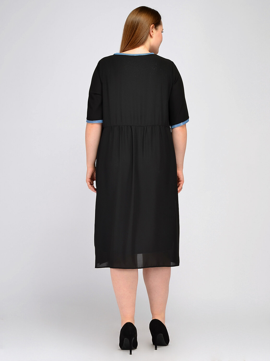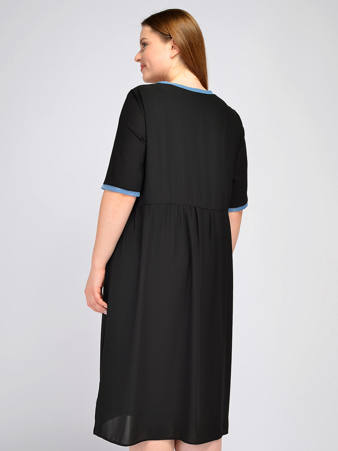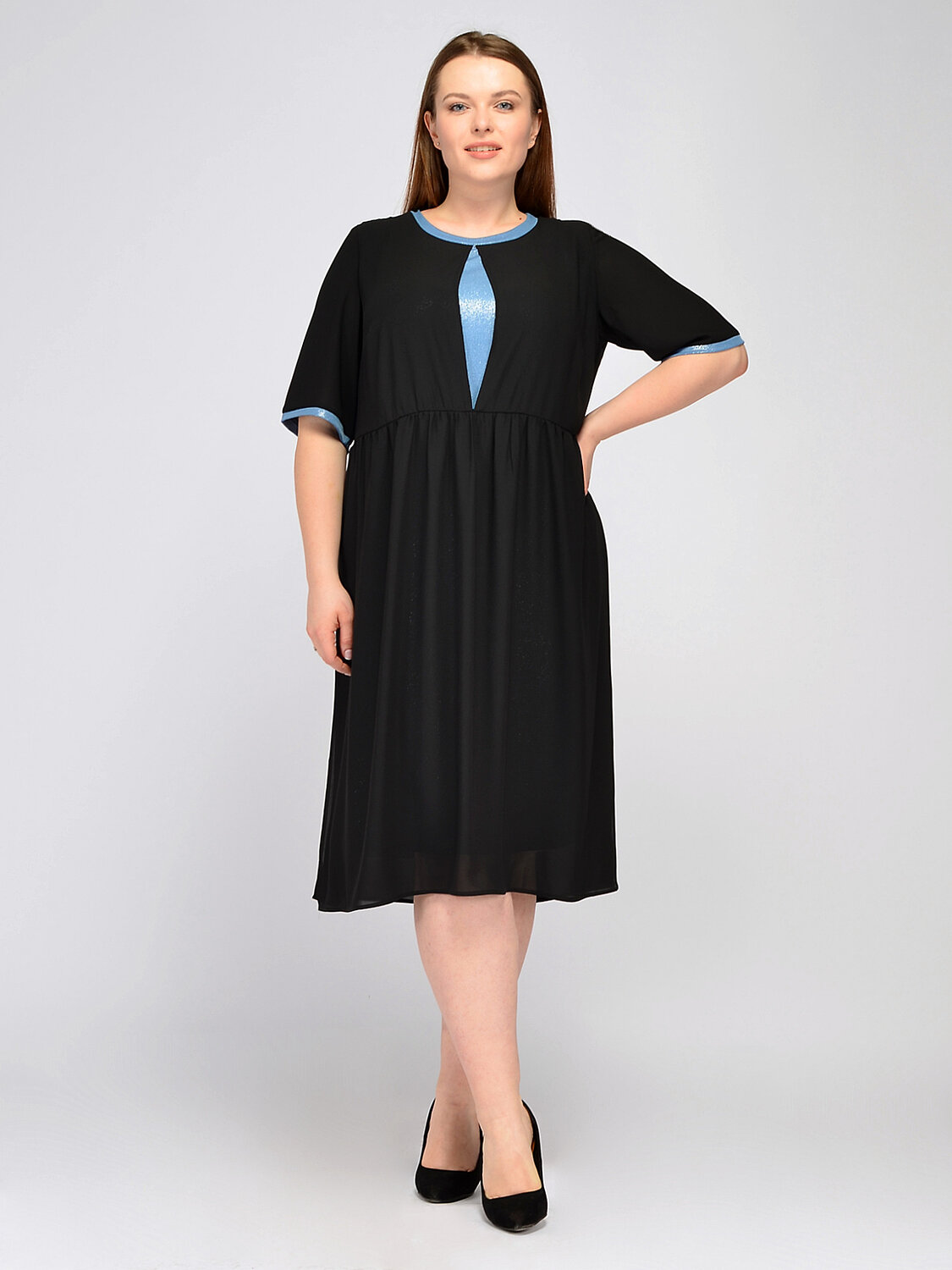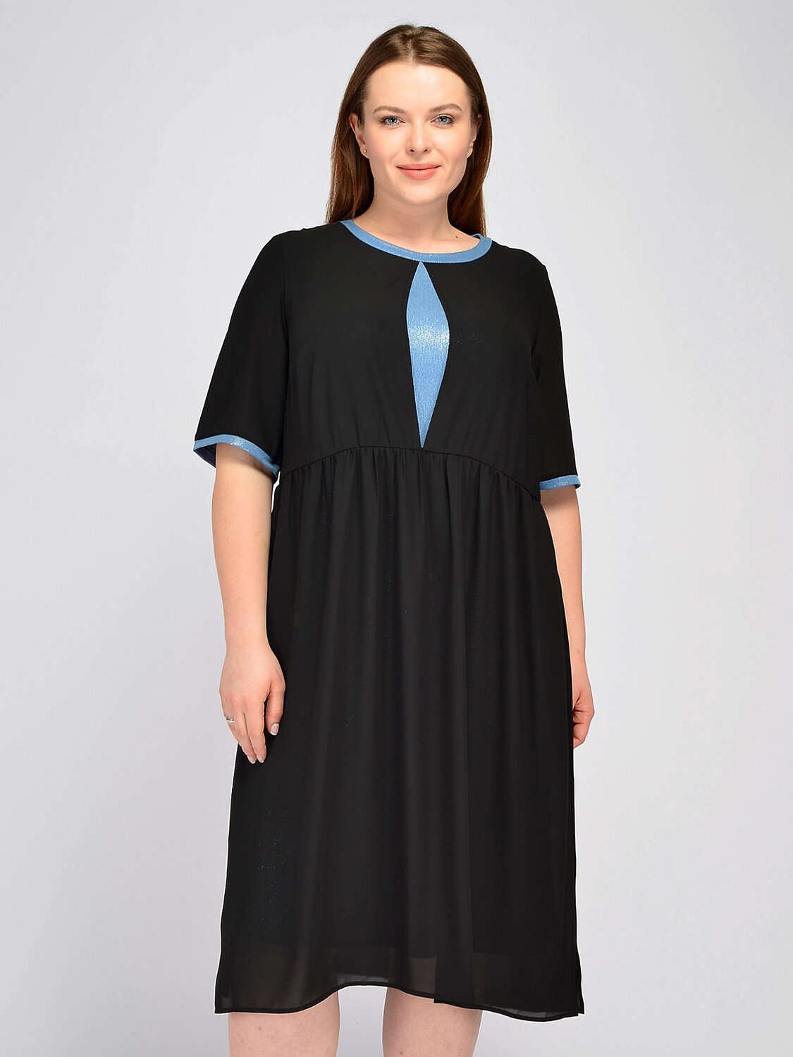 Вечернее платье миди с контрастными элементами. Выбирая платье для вечернего мероприятия, обратите внимание на прямое платье миди с укороченными рукавами до локтя. Контрастное обрамление воротника, рукавов и декоративная вставка на передней части платья добавляют ярких притягательных акцентов Вашему образу. Вырез горловины круглый. без отделки горловины. Рукава короткие. Без застежки. Без воротника. Длина миди. Комплектация с нижним платьем. Конструктивный элемент разрез. Крой прямой. Покрой свободный. Рукава втачные. Детали одежды люрекс. Рекомендована стирка при температуре не более 30С. Свободный покрой праздничного платья дополнен строчкой на талии, визуально делая Ваш силуэт похожим на форму песочных часов. Завершите торжественный образ ярким браслетом, обувью на высоком ходу и вечерней прической.