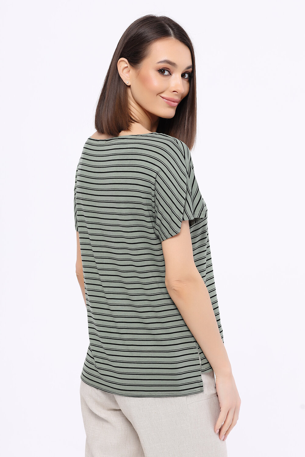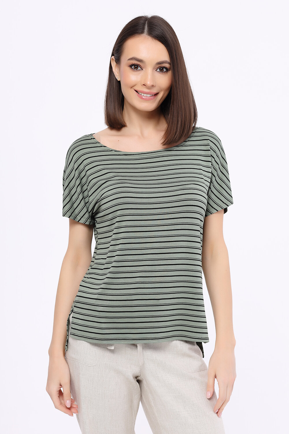 В составе блузки вискоза 95%, лайкра 5%. Вырез горловины - круглый. Без отделки горловины. Рукав короткий. Без застёжки. Декоративный элемент - разрезы. Крой прямой. Рукав цельнокроеный. Трикотажный материал. Рекомендована стирка при температуре не более 30С.