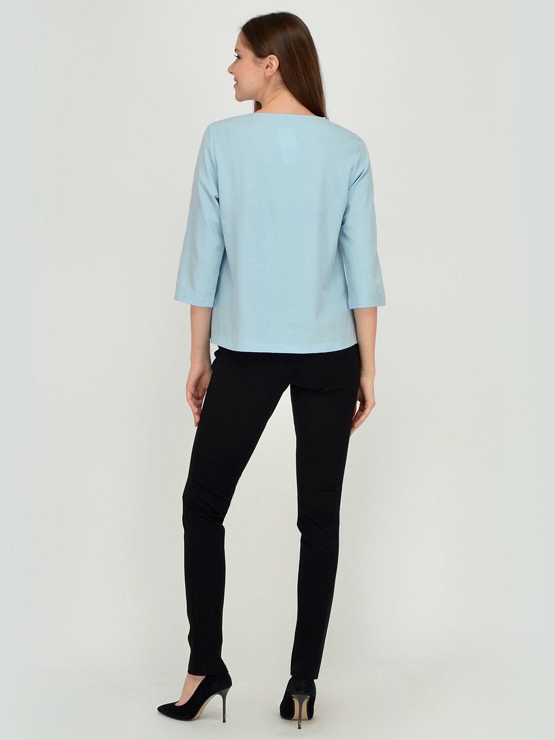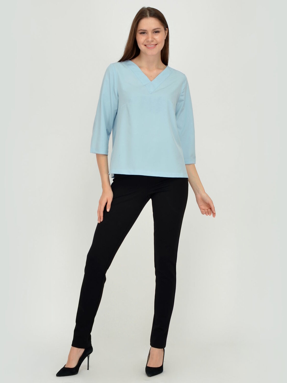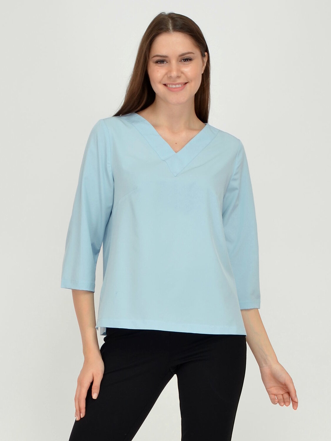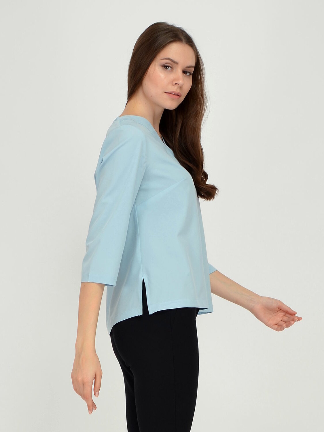 Блузка женская прямого силуэта, рукав три четверти. V-образный вырез горловины. В боковых швах разрезы.