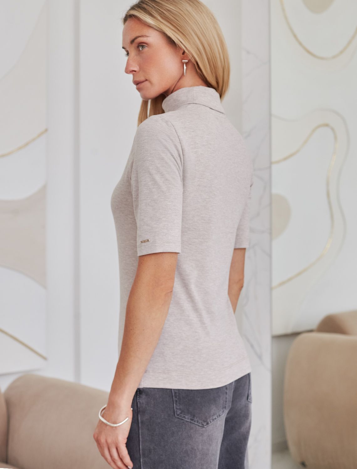 Водолазка с коротким рукавом выполнена из премиального хлопка с добавлением эластана. Гладкий трикотаж обеспечит гарантированный комфорт и удобство в использовании. Внизу изделия металлическая нашивка с логотипом бренда. Совет стилиста: водолазка может заменить рубашку в нестрогом офисном образе или подружиться с джинсами-трубами, жилетом и кедами в расслабленном повседневном наряде. кофейный меланж