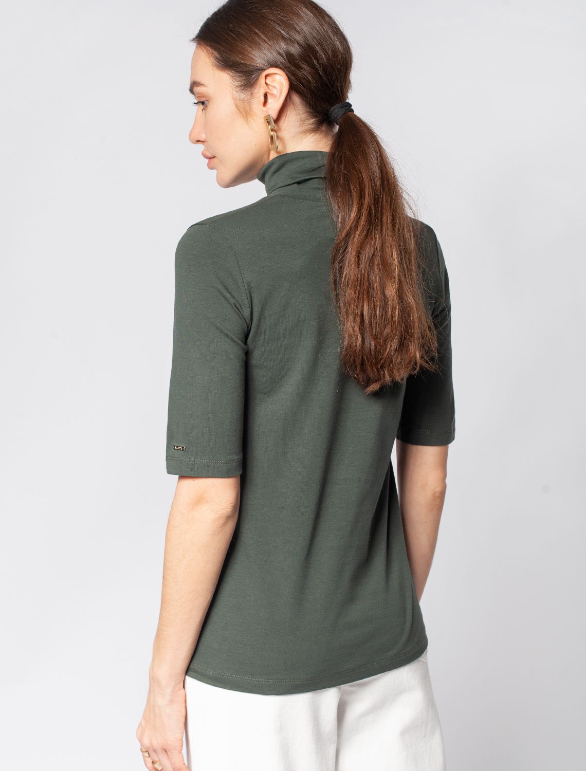 Темно-оливковая водолазка с коротким рукавом выполнена из премиального хлопка с добавлением эластичных волокон. Гладкий трикотаж обеспечит гарантированный комфорт и удобство в использовании. На рукаве изделия металлическая нашивка с логотипом бренда. Совет стилиста: водолазку с коротким удобно сочетать с жакетом или блузкой. Также как самостоятельный верх к широким брюкам.