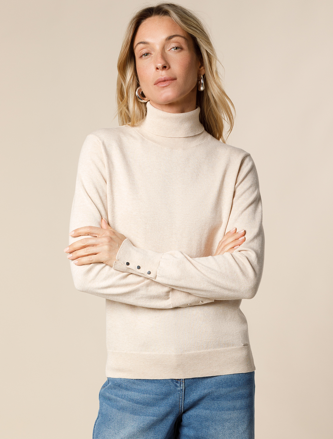 Водолазка тонкой вязки выполнена из хлопка. Лаконичная модель дополнена манжетами с золотистыми пуговицами. Изделие не сковывает движений и подходит для любой фигуры. Мягкая пряжа очень приятная к телу не колется и сохраняет тепло при этом не перегревая.