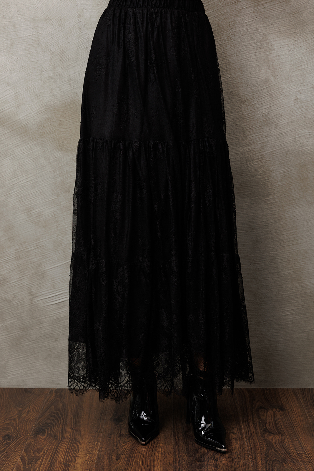 Юбка из кружева длинная на притачном поясе из кружева со вставленной в него резинкой. Юбка с 2-мя притачными слегка присборенными воланами. Юбка на подкладке. 100% ПЭ