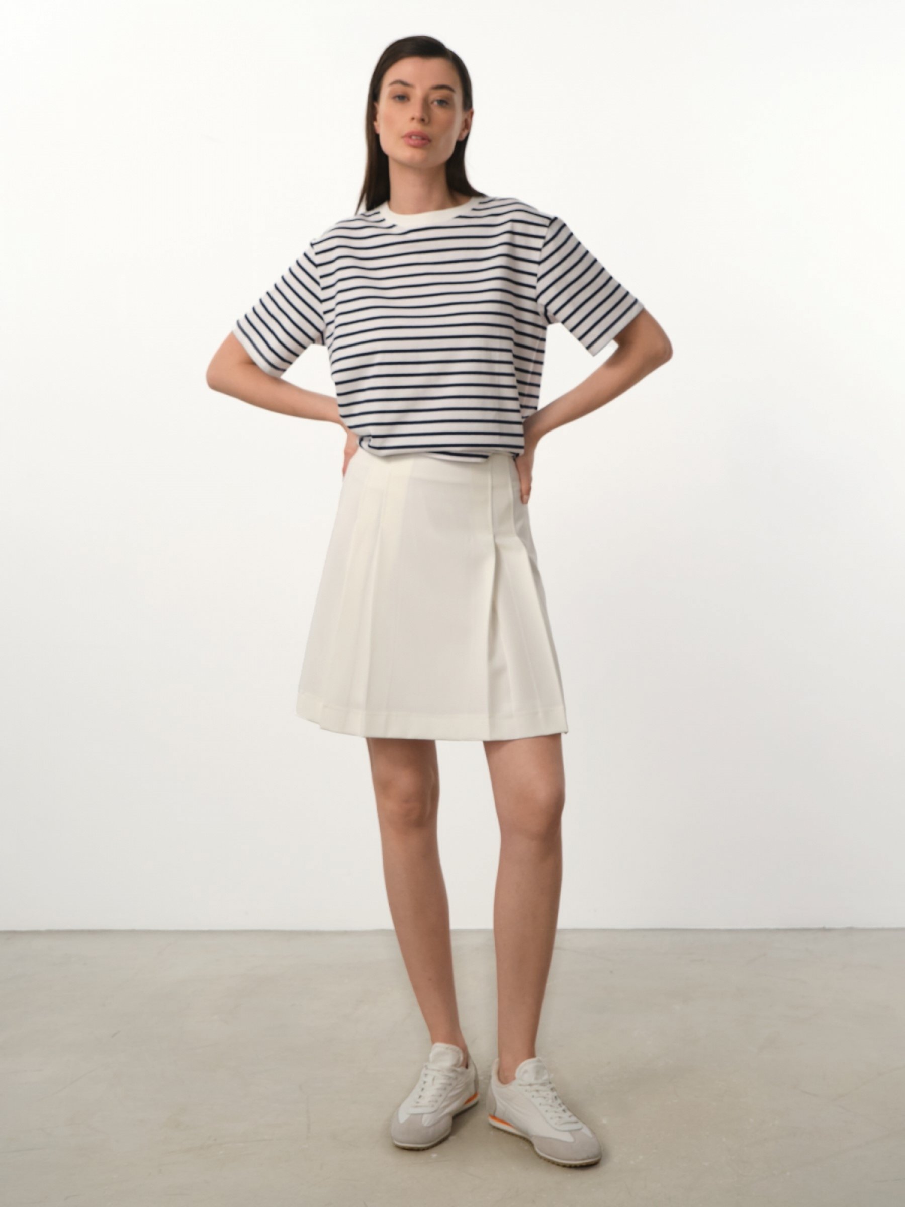 Юбка-трапеция с симметричными широкими складками придает образу спортивный шик. Благодаря высокой посадке подчеркивает талию и создает красивый силуэт. Выполнена из мягкого плотного смесового материала на основе отборного хлопка. Застегивается на боковую нейлоновую молнию в тон. Край по низу обработан строчкой в тон. Юбка отлично сочетается с джемперами, футболками, пуловерами оверсайз и обувью на плоской подошве. Белый цвет делает образы элегантными и нарядными. 65% полиэстер 31% район 4% спандекс