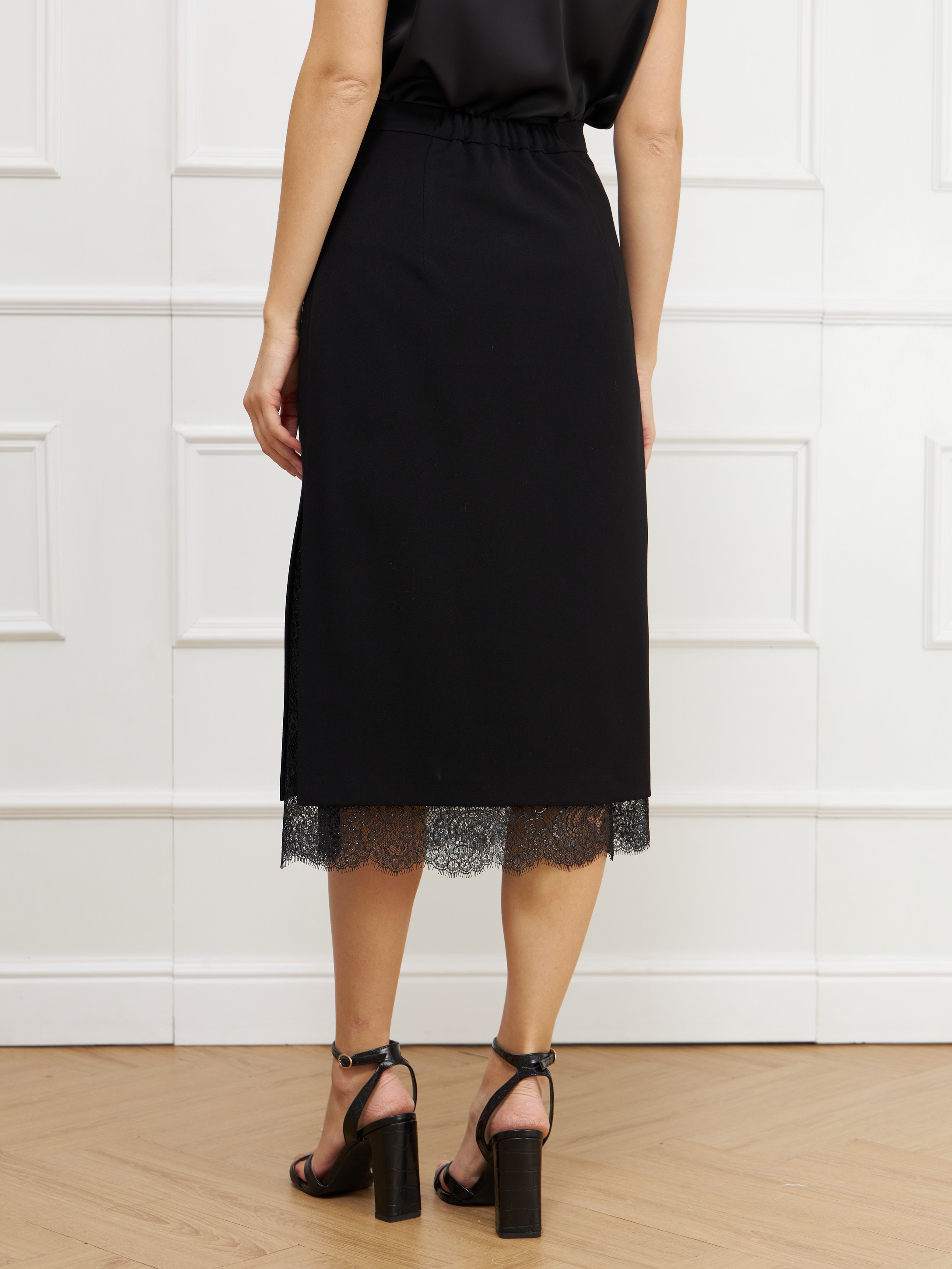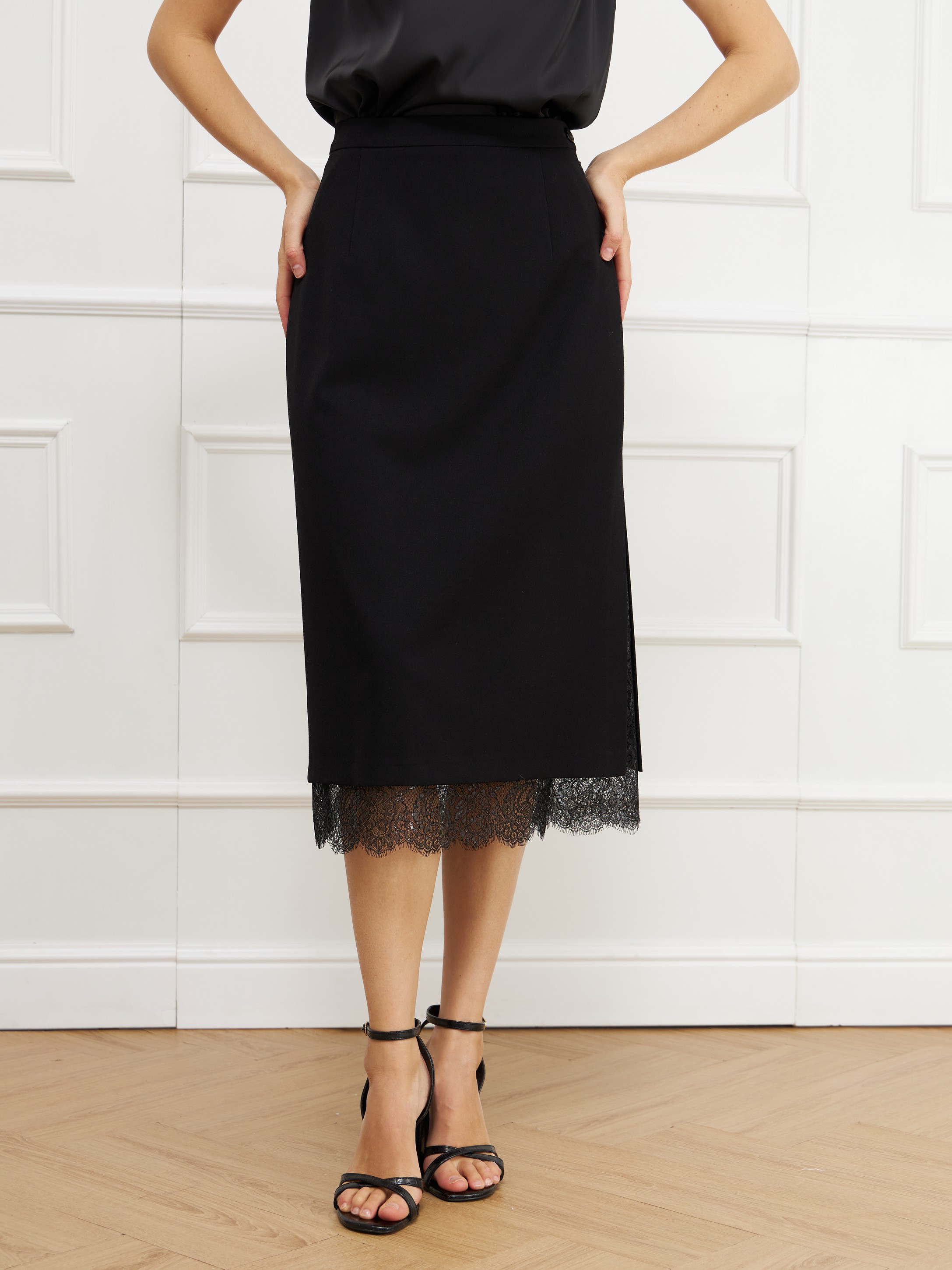 Чёрная юбка, в романтичном стиле, выполнена из плотной ткани с эластаном. Застежка на потайную молнию сбоку, пояс с резинкой на спинке. По низу юбки выглядывает полупрозрачное кружево «шантильи» с фестонами по краю, настроченное на нижний слой из подкладки. Высокий разрез слева приоткрывает кружевную вставку, вшитую в подкладку. Микс плотного материала и нежнейшего кружева с деликатным блеском делает привычную юбку акцентной вещью в любом образе. На фото в паре Блузка Д-218 АКР(В5) , Жакет В-949 ВСЛ(В5) , Жакет В-911 АЛС(О4).