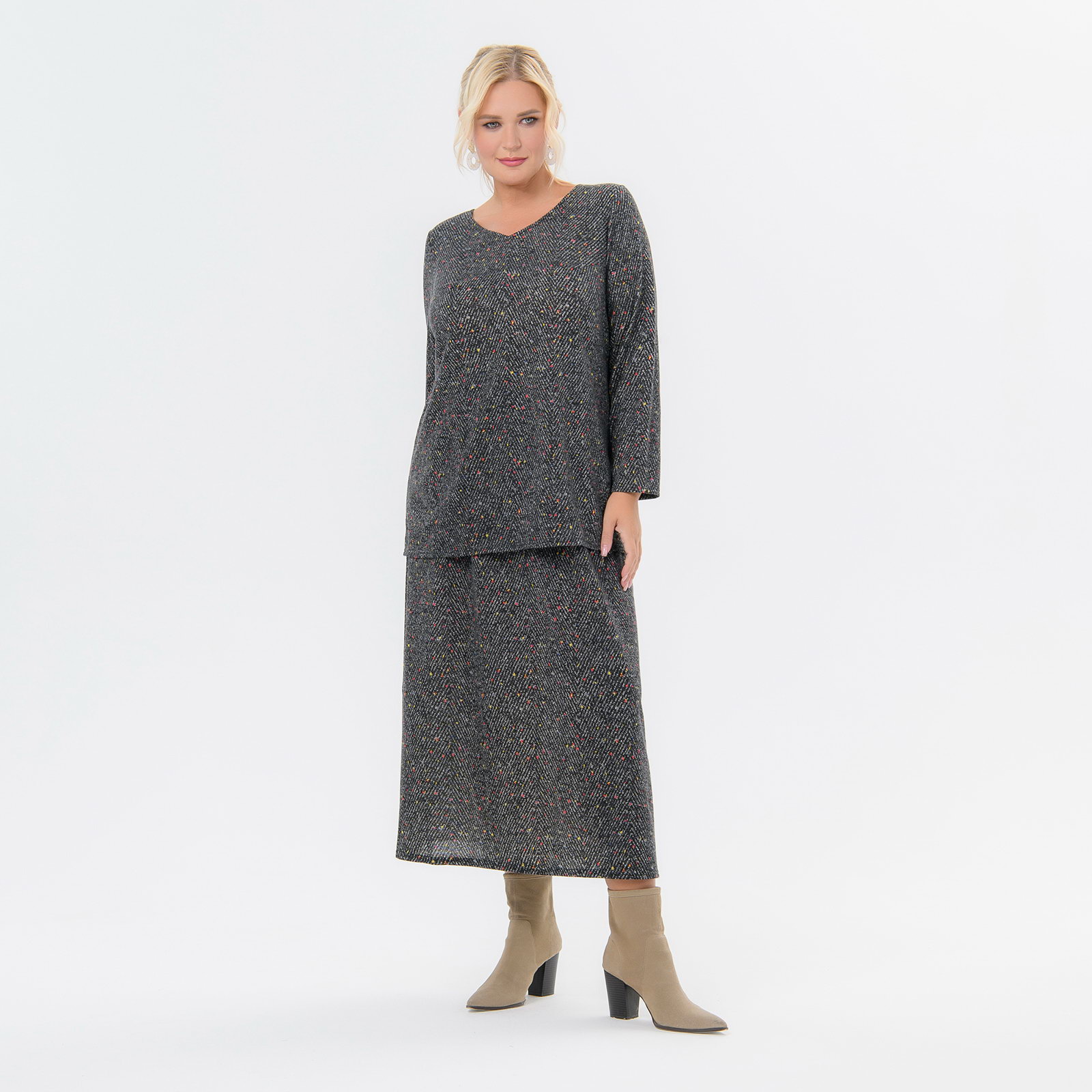 Юбка  выполнена из нового артикула джерси, имитирующего ангору.