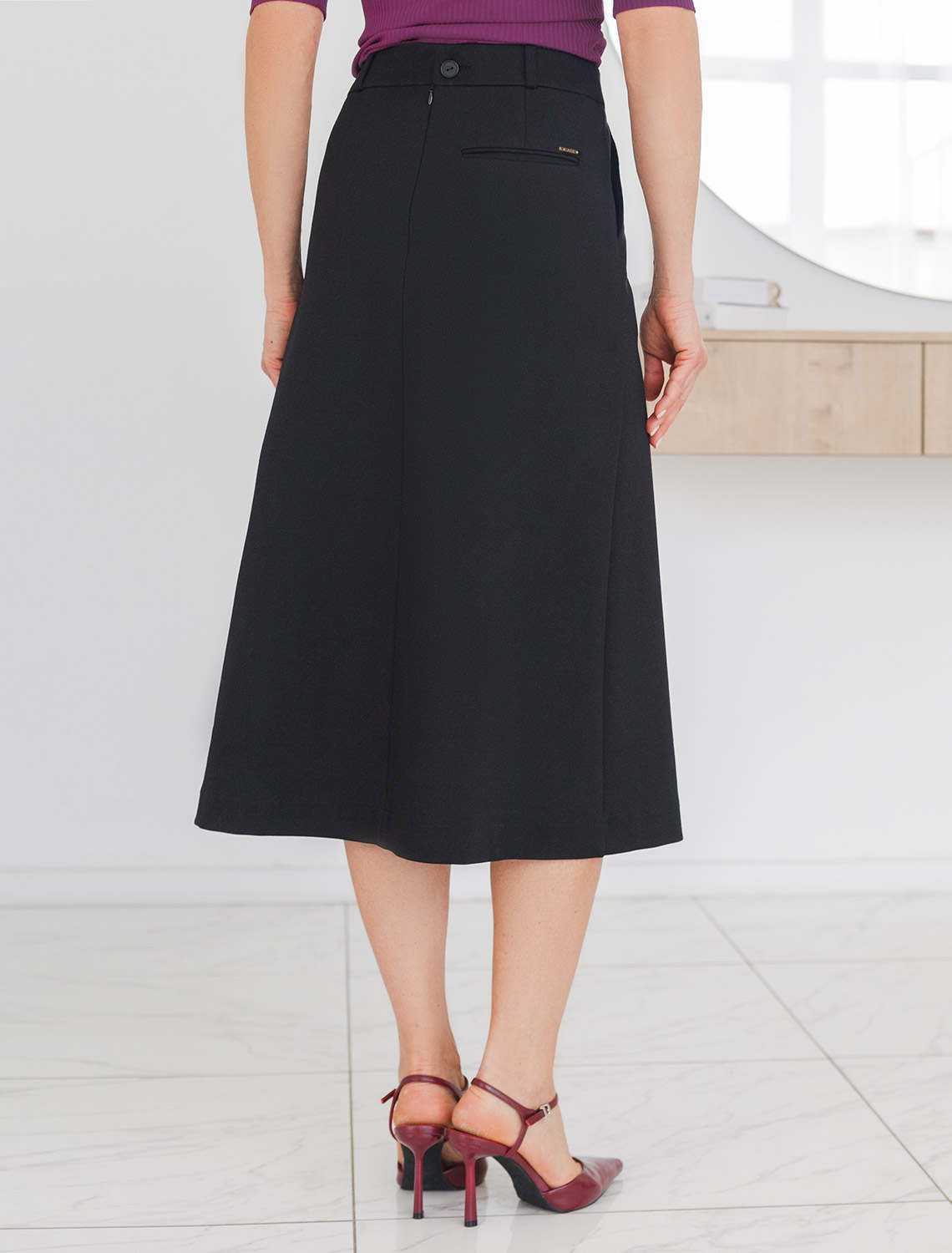 Юбка А-силуэта выполнена из джерси. Модель дополнена шлевками для пояса, высоким разрезом спереди и боковыми карманами. Изделие хорошо держит форму, отлично тянется и почти не мнется во время использования. Идеальный вариант в офис или в повседневный классический стиль. черный