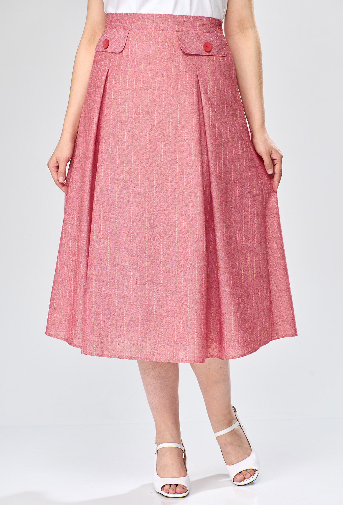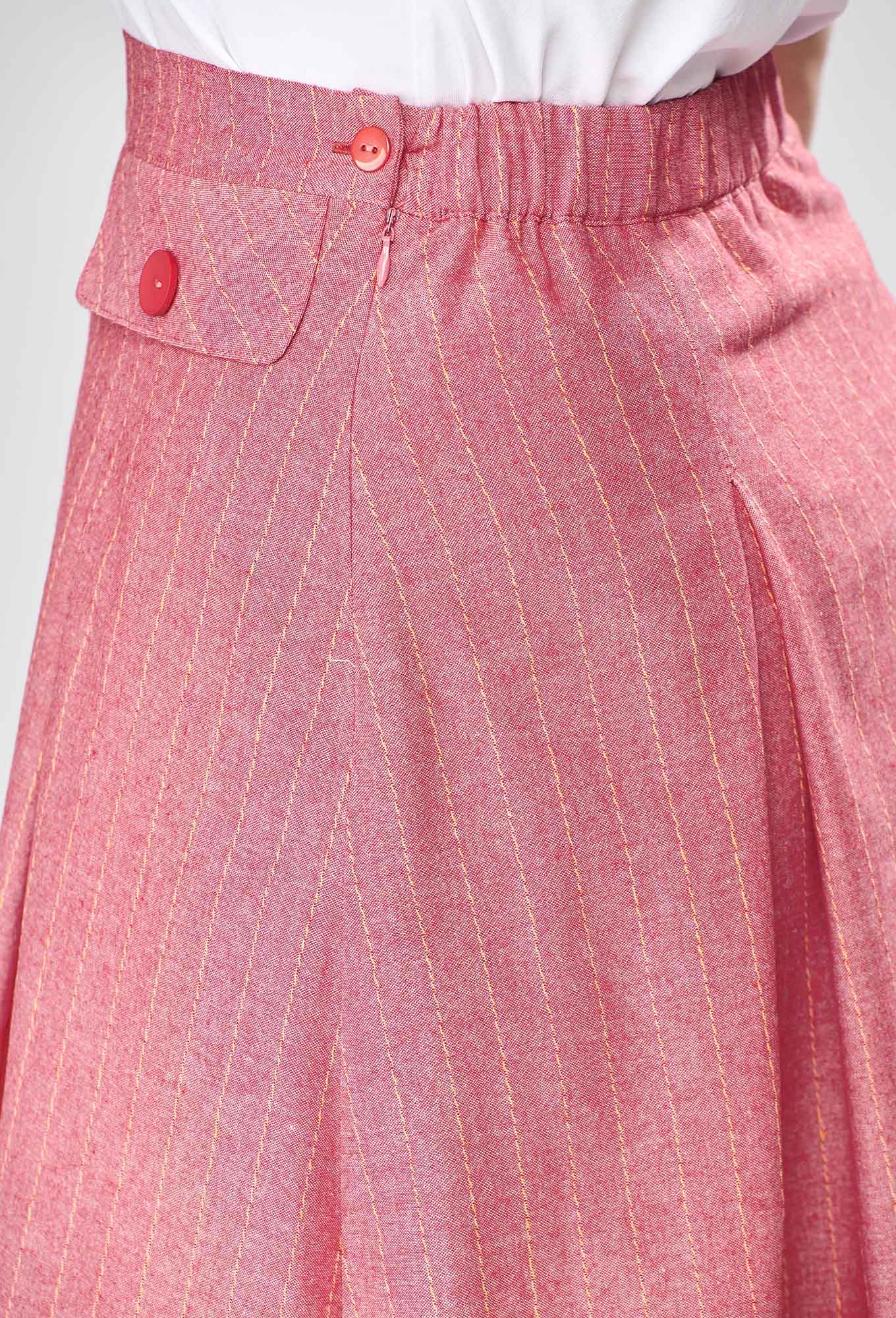 Юбка конической формы, длиной миди. На подкладке. Передняя часть юбки со встречными складками и клапанами с декоративными пуговицами. Задняя часть юбки также со встречными складками. Застежка на потайную молнию в левом боковом шве. Юбка на притачном поясе с эластичной тесьмой по задней части пояса и застежкой на петлю и пуговицу.