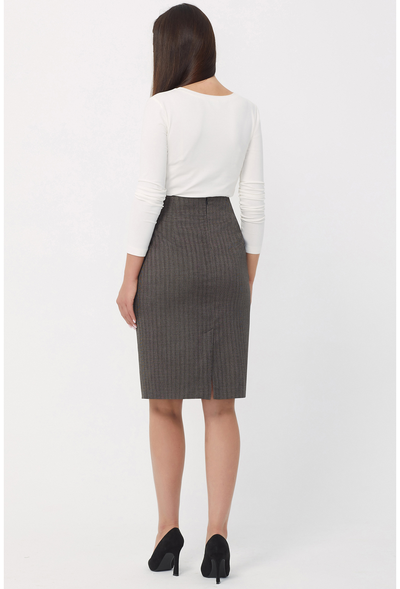 Юбка-крандаш на обтачке, в среднем шве спинки обработана потайная молния и шлица, на подкладке. Юбка-карандаш со слегка завышенной линией талии. На подкладе