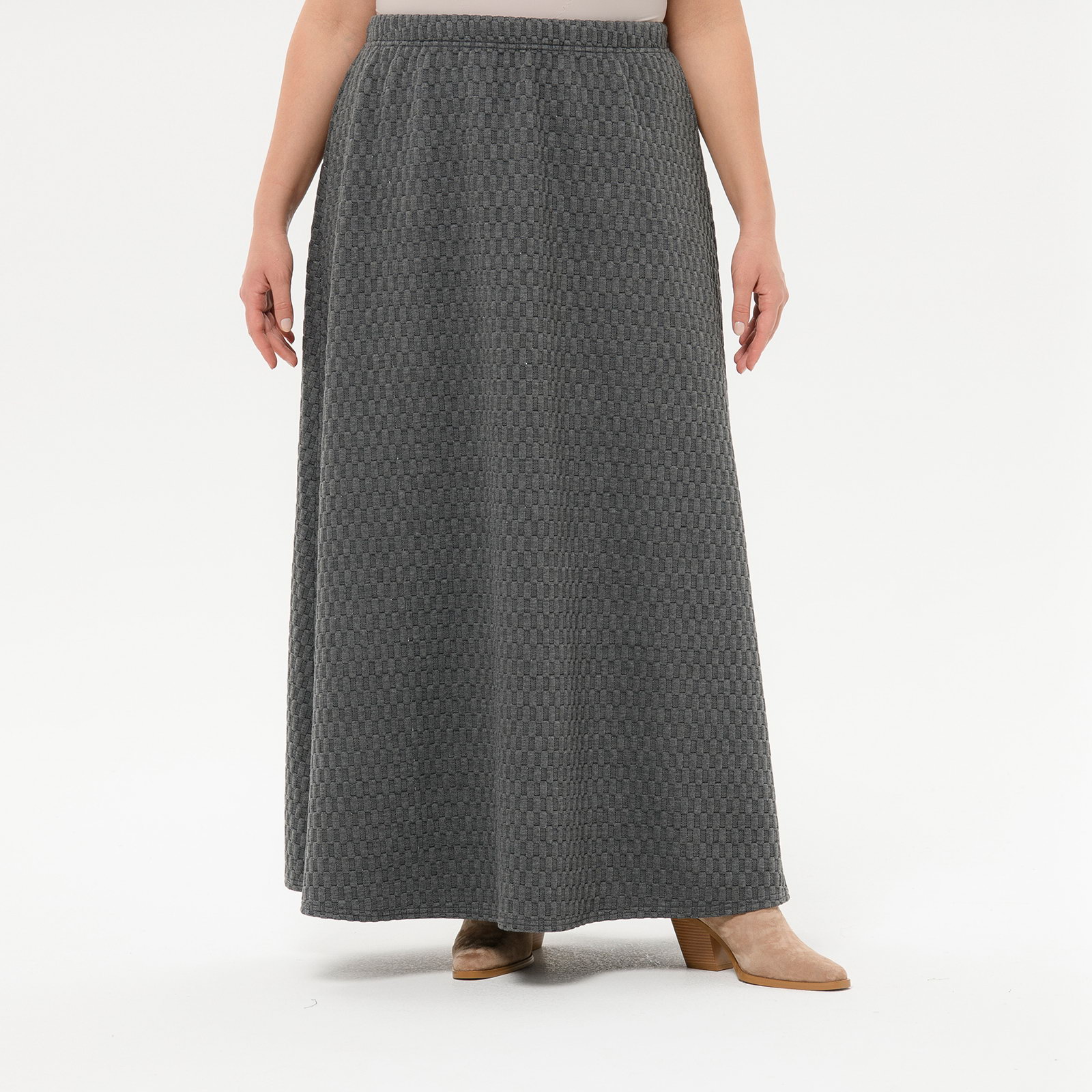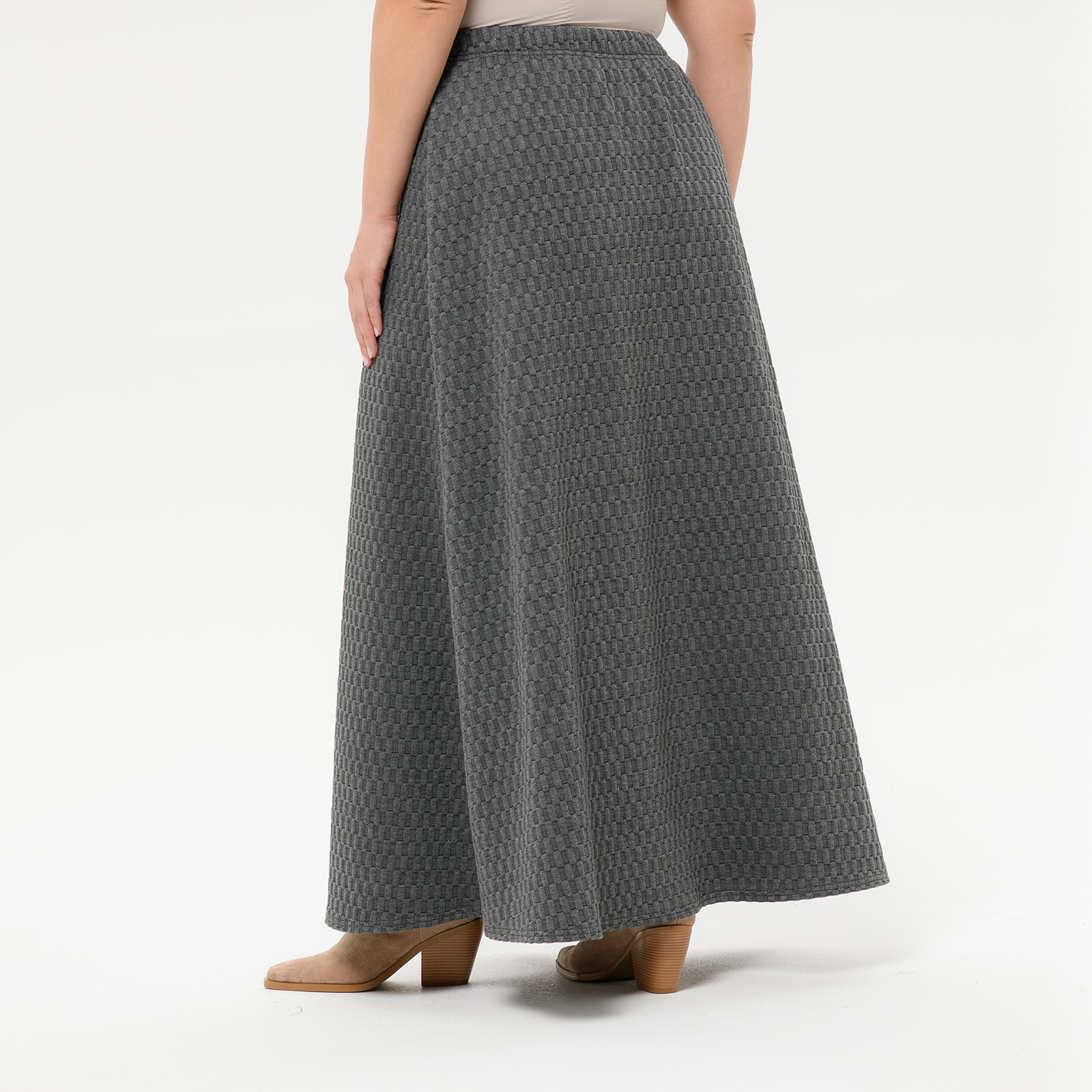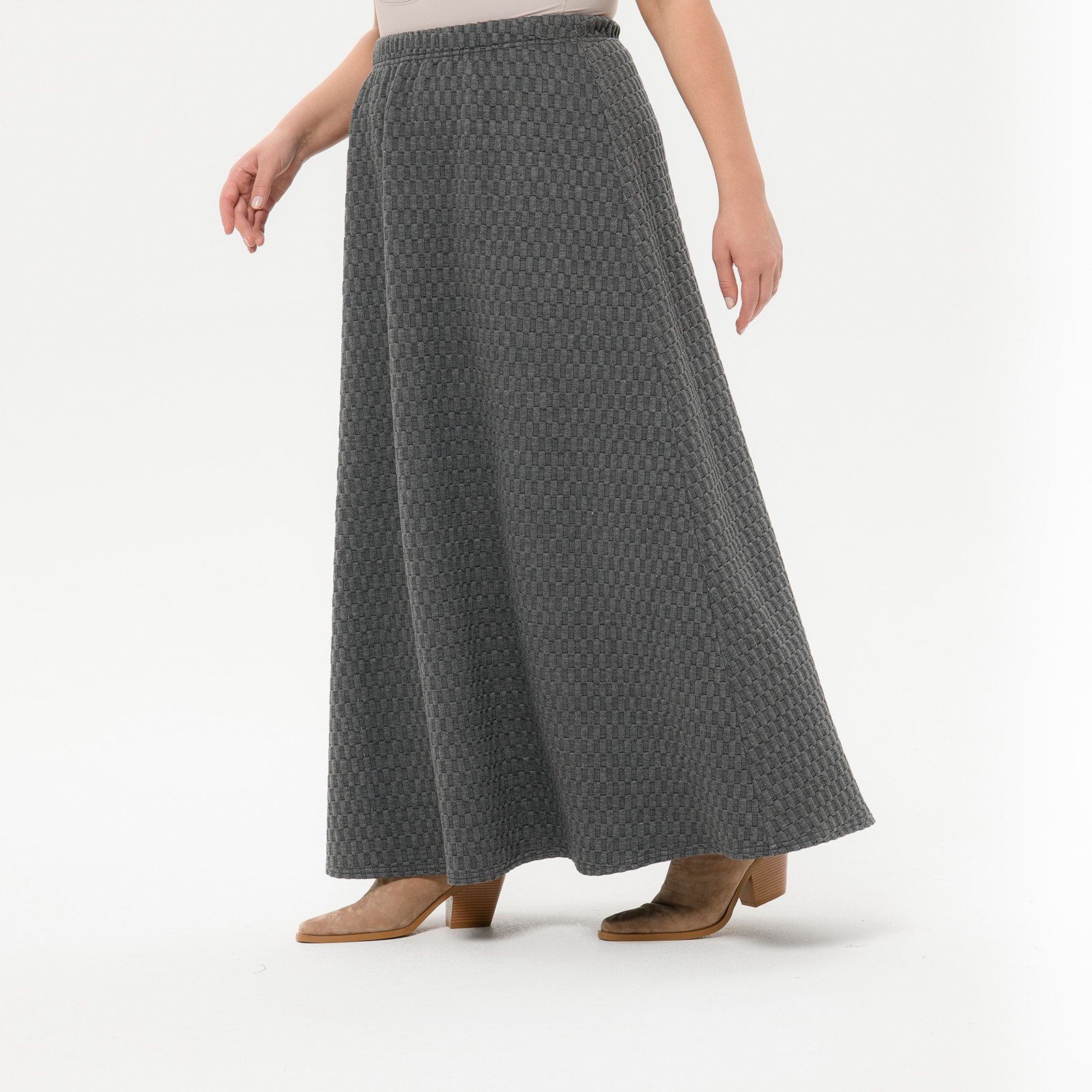 Юбка длинная из фактурного трикотажа, трапецевидного силуэта.