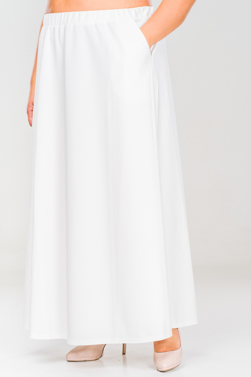 Однотонная расклешеная юбка из крепа с эластаном. Верх на широкой резинке, в боковых швах - карманы.