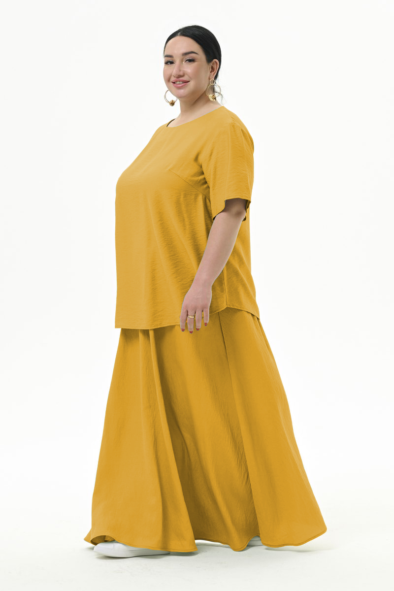 Юбка длинная расклешенная из плотной плательной вискозы. Верх на широкой резинке, в боковых швах - карманы.
