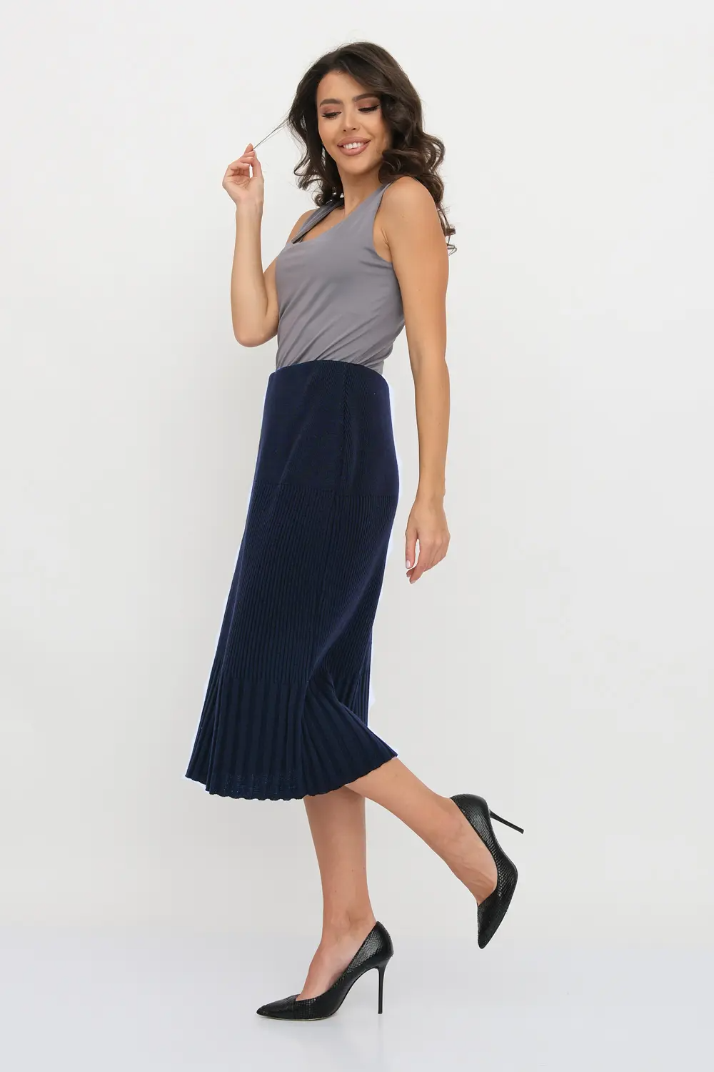 Классическая юбка полуприлегающего силуэта. Переплетение-лапша от узкой по бедрам до широкой по низу изделия. В пояс горизонтально проложена эластичная резинка. темно-синий