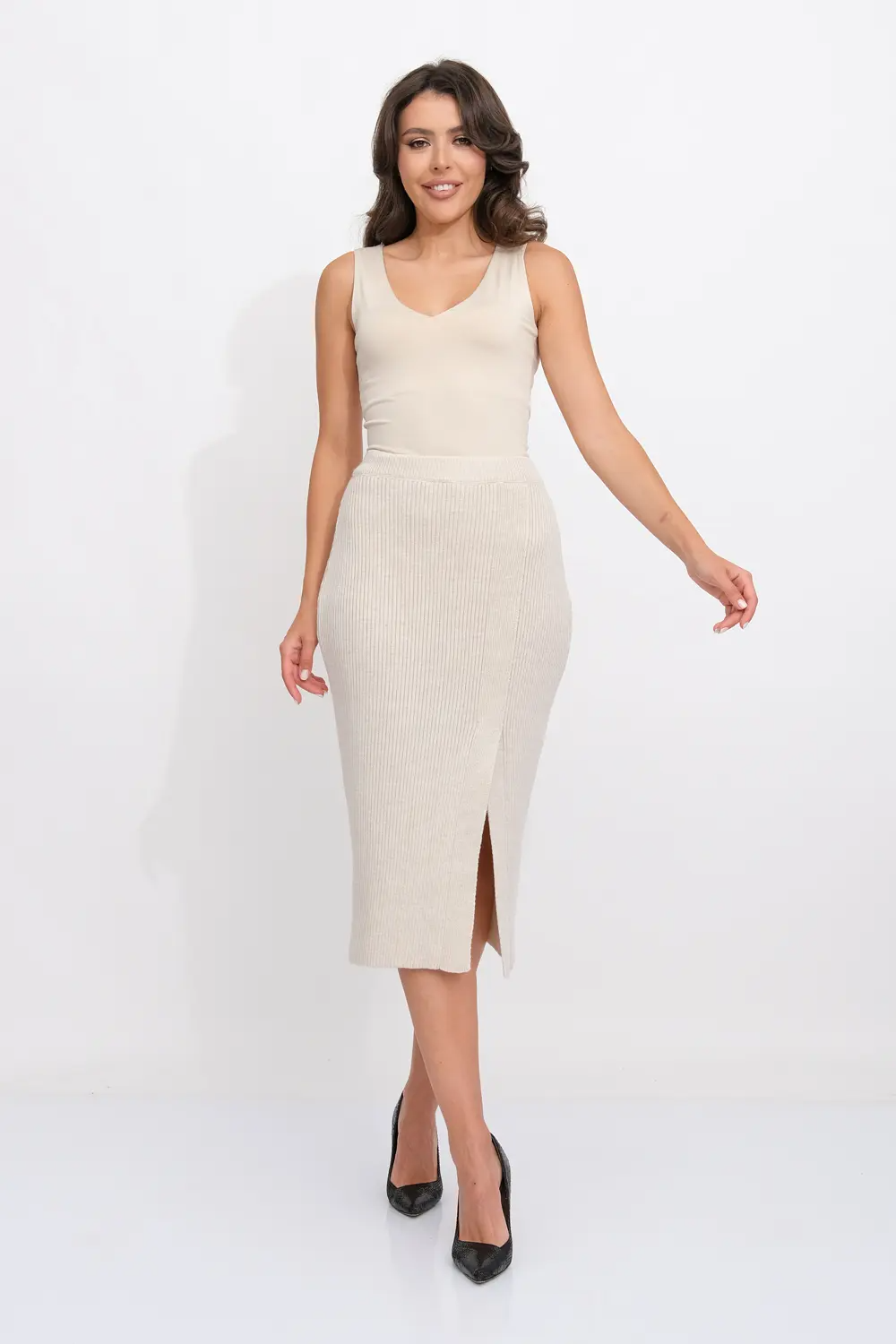 Классическая юбка полуприлегающего силуэта. В пояс горизонтально проложена эластичная резинка. На переднем полотне изделия элегантная шлица. бежевый