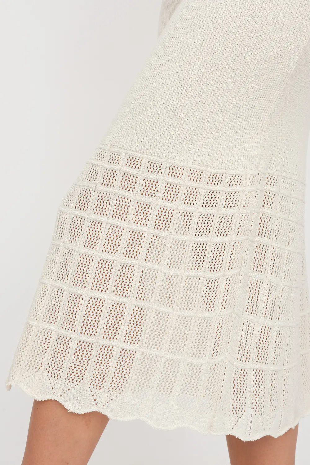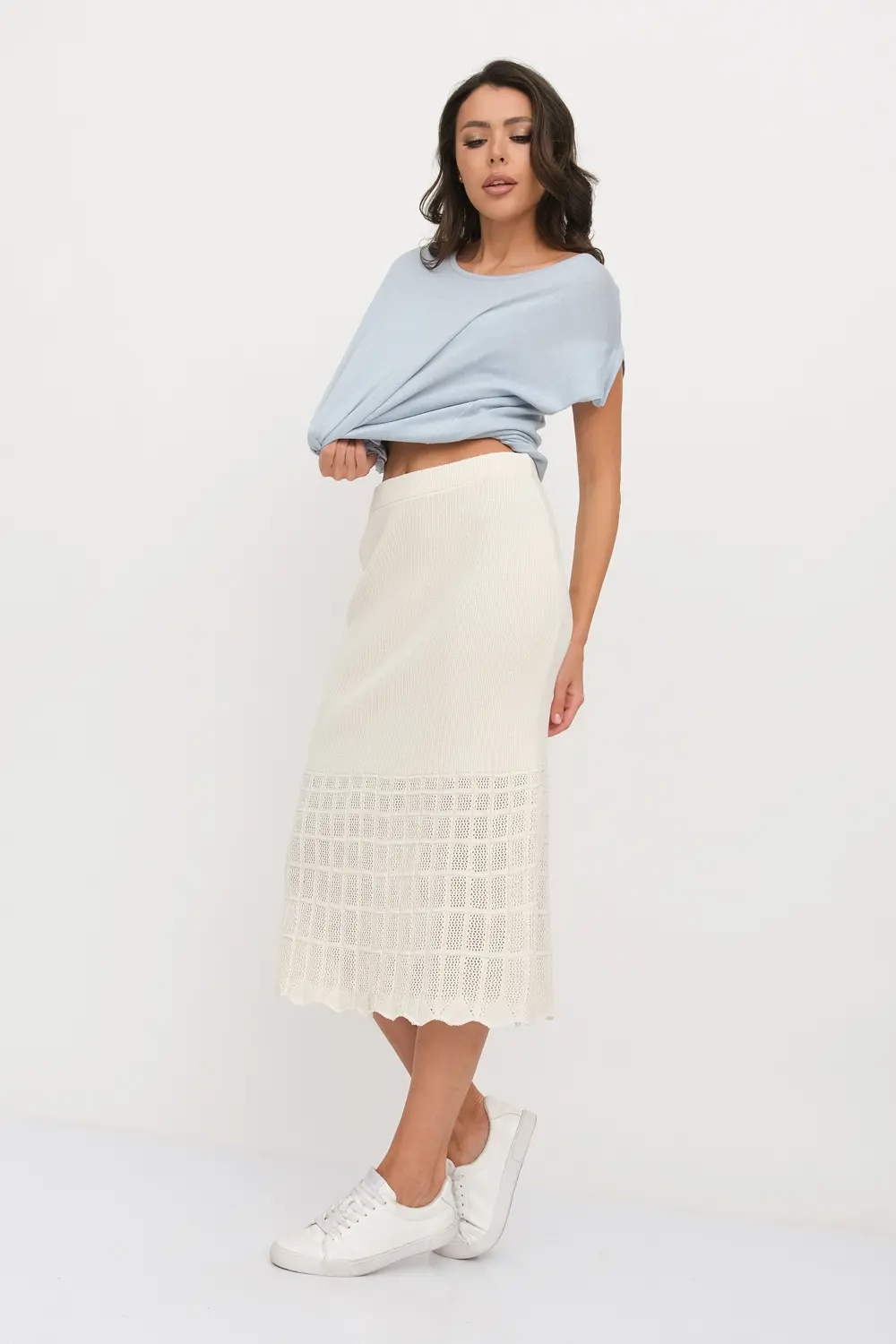 Классическая юбка полуприлегающего силуэта. Ширина переплетения-лапша увеличивается от пояса до колена, нижняя треть юбки выволнена ажурным переплетением. В пояс горизонтально проложена эластичная резинка. Юбку можно носить в комплекте с джемпером И 024, выполненным аналогичным переплетением и узором.