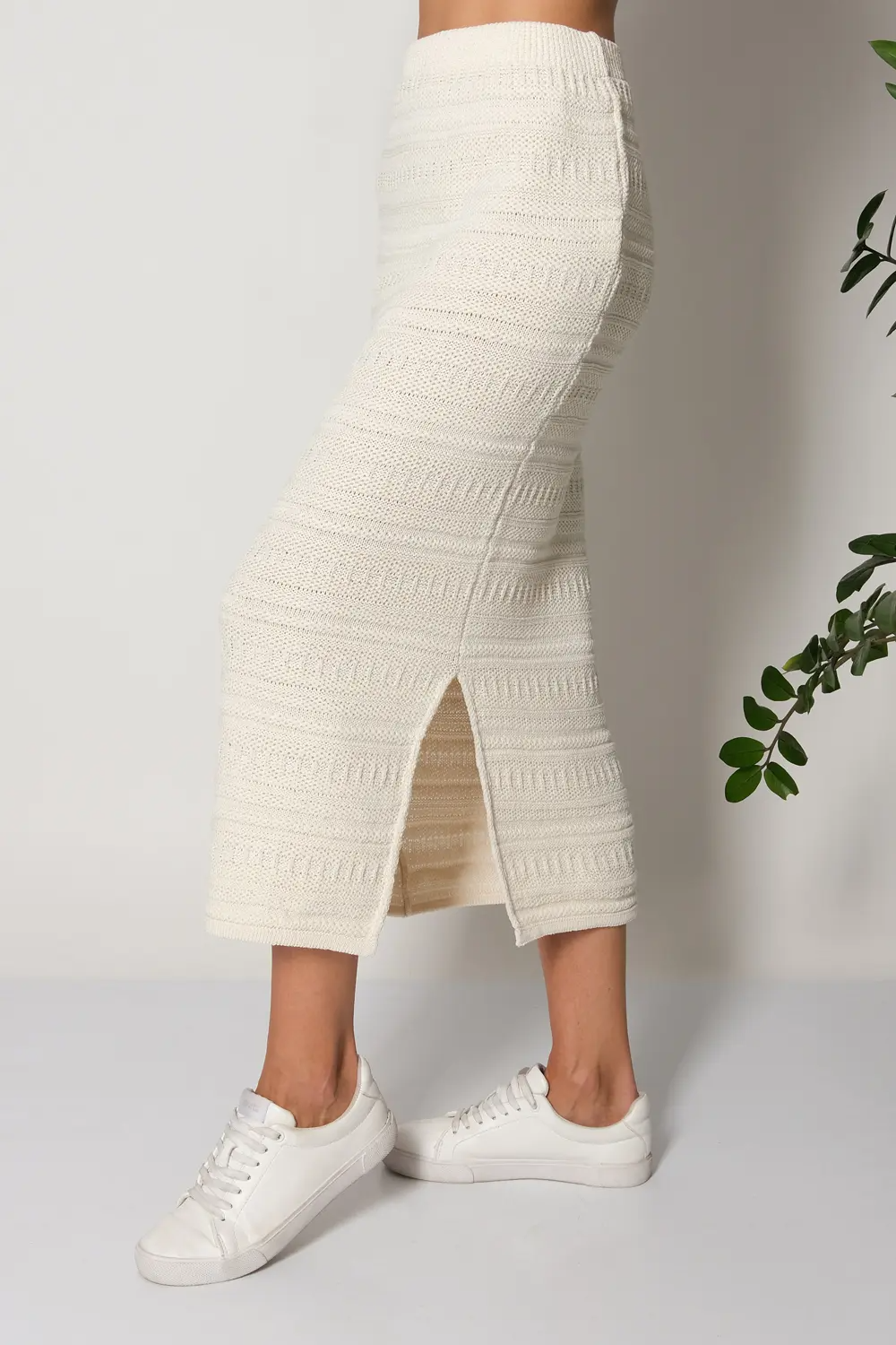 Классическая юбка прилегающего силуэта с боковым разрезом до колена. Юбка выполнена структурным рельефным переплетением. Можно носить как костюм с джемпером И 020. льняной