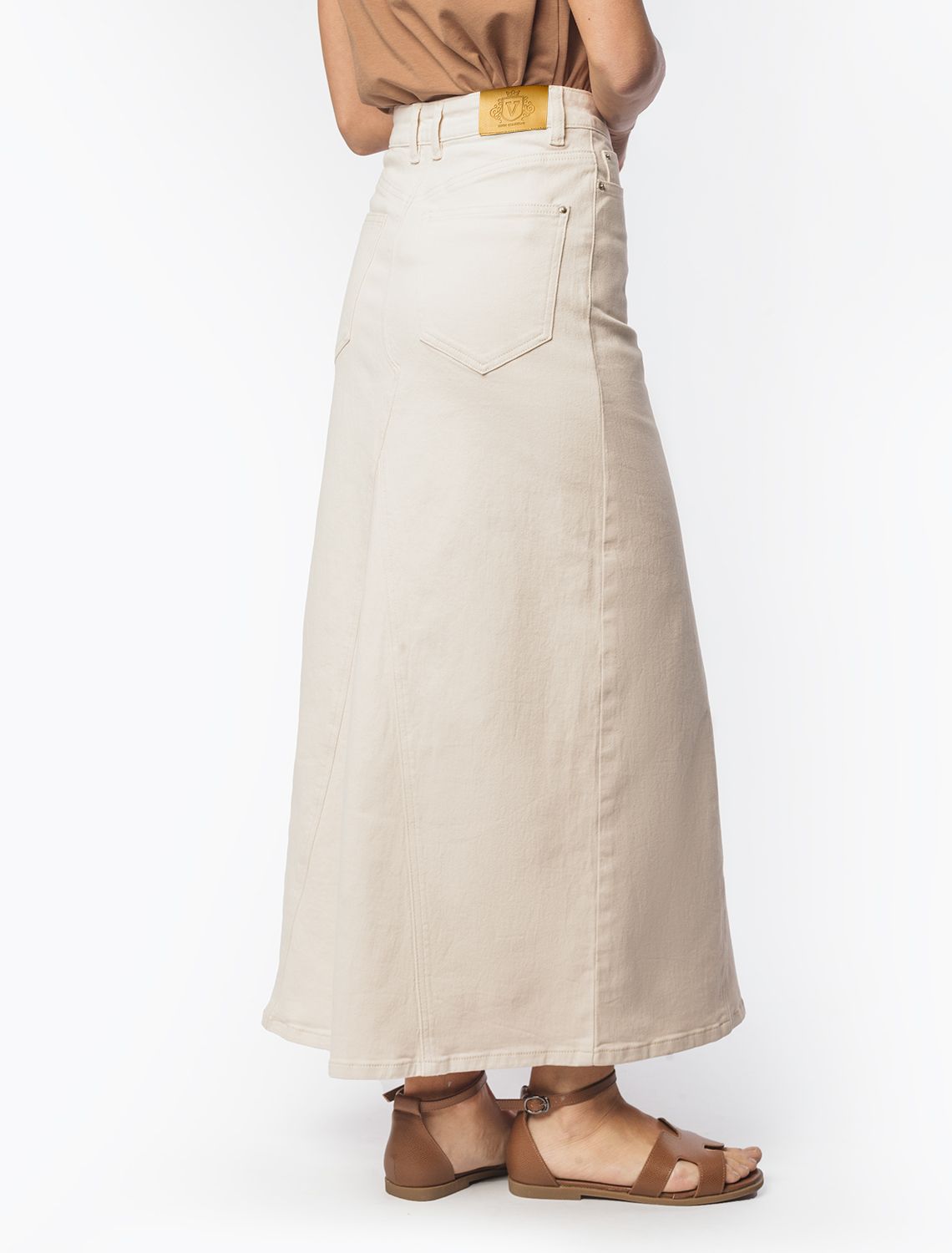 Юбка А-силуэта выполнена из денима с эластаном. Модель с посадкой на талии расширяется к низу за счет вставок из декоративных клиньев, расположенных спереди и сзади. Изделие дополнено пятью карманами как у джинс и брендированным патчем из эко-кожи. Сочетается в комплекте с курткой D51.033