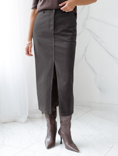Юбка прямого кроя с выполнена из мягкого хлопкового микро-вельвета с добавлением эластана. Модель дополнена высоким разрезом спереди. Изделие комфортно садится по фигуре и не сковывает движения. Хорошо комбинируется с вязаным трикотажем, блузками и денимом. Также прекрасно станет альтернативой деловым низам в нестрогом офисном дресс-коде. серый