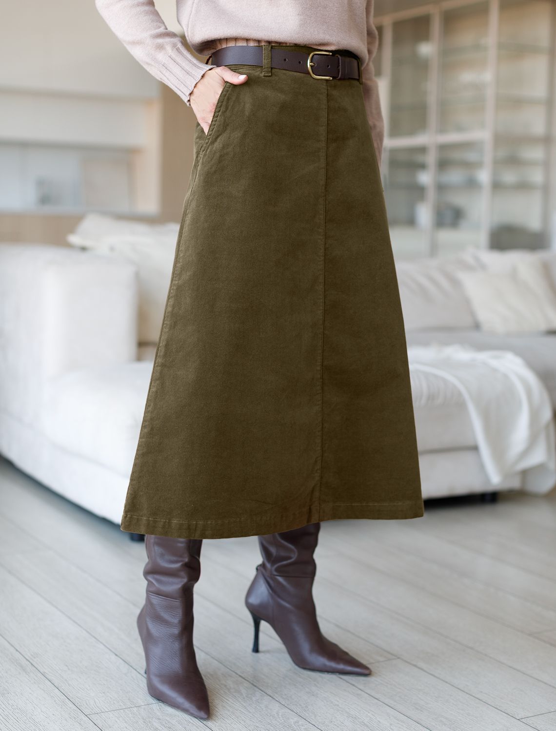 Юбка-миди трапециевидного силуэта выполнена из мягкого хлопкового микро-вельвета с добавлением эластана. Изделие комфортно садится по фигуре и не сковывает движения. Модель дополнена высококачественной фурнитурой с фирменным логотипом бренда. Хорошо комбинируется с вязаным трикотажем, блузками и денимом.Также прекрасно станет альтернативой деловым низам в нестрогом офисном дресс-коде.