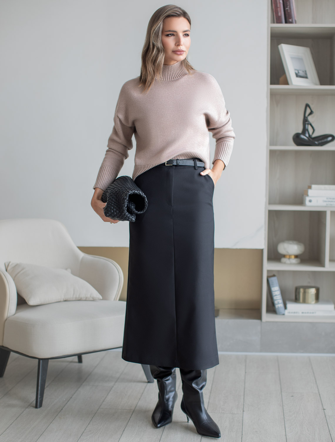 Юбка выполнена из плотной эластичной ткани из хлопка с нейлоном. Модель А-силуэта дополнена боковыми карманами и разрезом сзади. Любимая классика делового стиля, которая должна быть в любом гардеробе, так как такая вещь практична и многофункциональна. Для особого случая на важной встрече в паре с блузкой или для офисного дресс-кода. черный