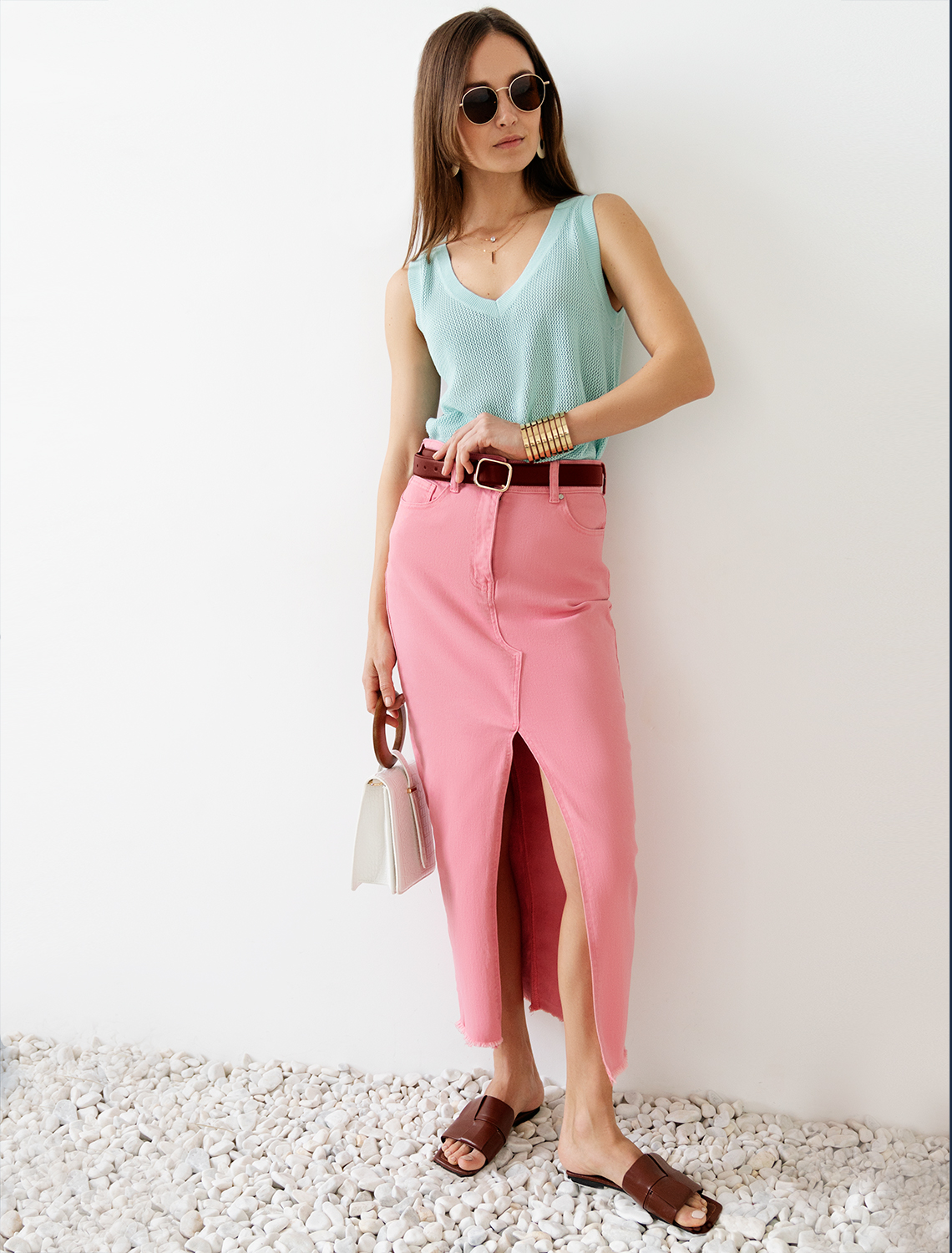 Юбка выполнена из суперэластичного денима. Трендовая модель с разрезом спереди и необработанным краем выгодно подчеркивает изгибы тела и подходит для любой фигуры. Материал отлично держит форму, не вытягивается и сохраняет свой безупречный вид в течении долгого времени. Сочетайте в костюме total-denim с курткой-жакетом D51.013 и курткой-рубашкой D59.008 розовое облако