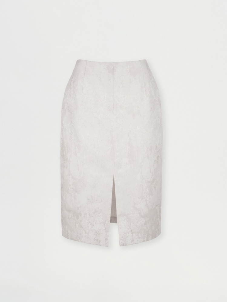 Идеальный вариант для торжественных случаев или для того, чтобы создать себе ощущение праздника каждый день. Юбка-карандаш из роскошного двухтонного жаккарда — кремовый узор на сливочном фоне. Сочетание двух оттенков молочного цвета создаёт дорогой и изысканный образ. Материал наполовину состоит из натурального хлопка. Дополняет жаккард гладкая молочная подкладка с высоким содержанием вискозы. Модель длиной чуть ниже колена имеет разрез спереди. Завершить образ с юбкой можно жакетом из комплекта