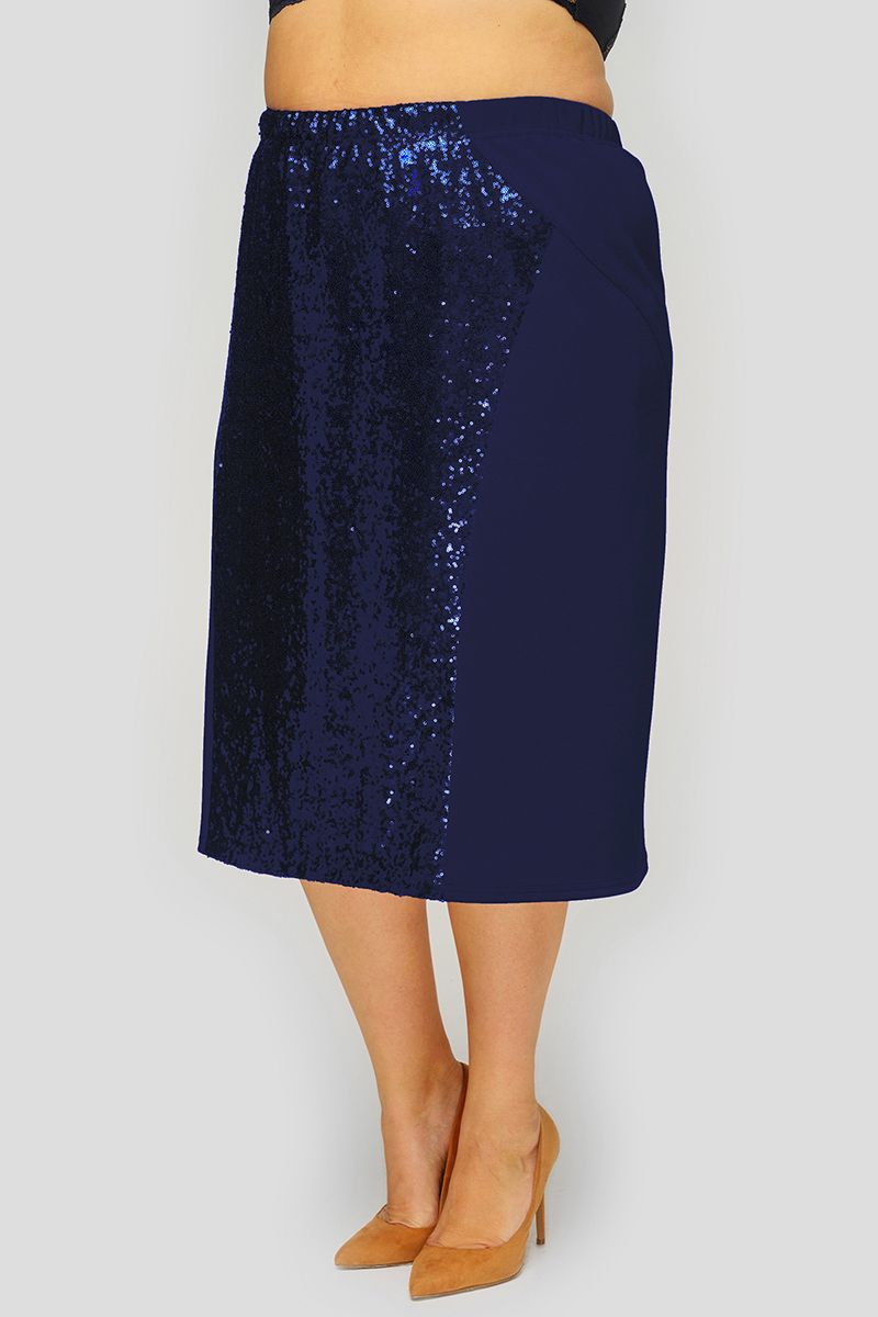 Классическая юбка-карандаш, зауженная к низу, из крепа с эластаном. Центральная часть передней половинки из пайеток. Верх на широкой резинке, не стесняющей движение.