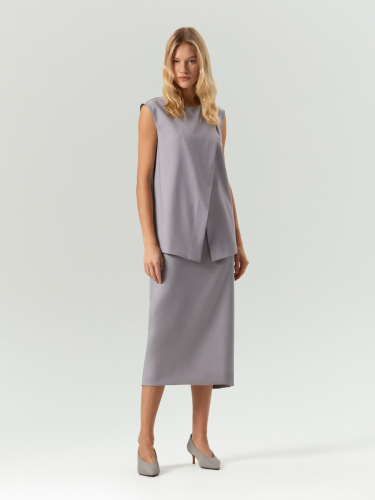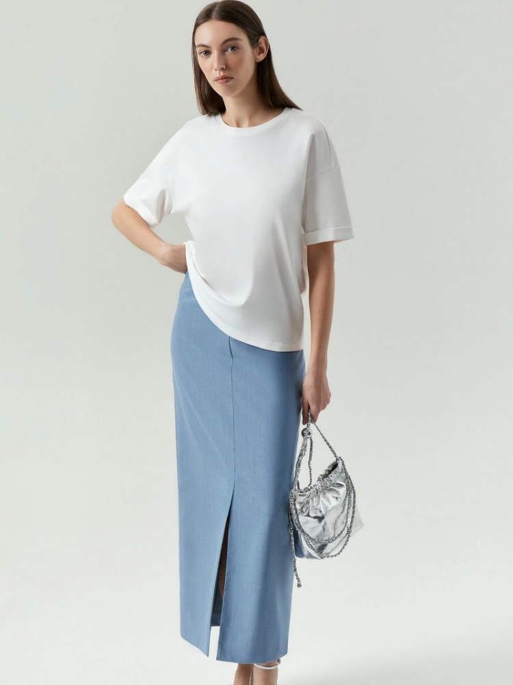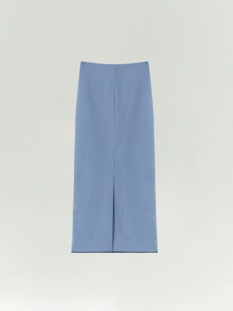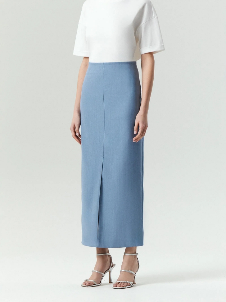 Юбка-карандаш в разбелённом голубом цвете — must have сезона. Цвет сейчас на пике моды, создаёт женственный и лёгкий образ, при этом допустим в деловом дресс-коде и легко вписывается в базовый гардероб. Тонкий, но тёплый материал с содержанием шерсти отлично подойдёт на демисезон. Базовая модель имеет высокую посадку и длину мидакси. Дополнена глубоким разрезом: удобно в движении и поддерживает тренды сезона. Застёгивается на молнию сзади. Изготовлена на подкладке. Юбка может стать основой капсулы с брюками и платьем nikolo