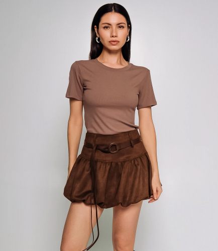 Юбка — это часть гардероба, которая подчёркивает женственность и привлекательность любой женщины. Юбка короткой мини-длины выполнена из мягкого плотного материала с лёгкой структурой и небольшой бархатистой фактурой, имеет высокий пояс с предусмотренными петлями и декоративным длинным тонким ремнём с круглой пряжкой, верхняя часть пояса плотно облегает талию, ниже идёт широкая кокетка с тонкой сборкой, сама юбка скроена в виде объёмной колокольной формы с активной сборкой по шву кокетки, создающей выраженные мягкие складки и воздушный объём по всей окружности. Для пошива использован материал: 100% полиэстер. Такая ткань отличается прочностью, лёгкостью и простотой в уходе; она хорошо держит форму и сохраняет презентабельный вид даже после многократных стирок при соблюдении рекомендаций по уходу. Цвета глубокие и насыщенные, полностью соответствуют фотографиям на странице, что важно при комплектовании витрин и формировании коллекций. На сайте представлена таблица размеров — с её помощью вы сможете самостоятельно снять мерки и подобрать подходящие размеры для ваших покупательниц. Для оптовых покупателей мы предлагаем выгодные условия сотрудничества, гибкую ценовую политику и надёжные поставки для магазинов. Установленная цена адекватна и позволит вам формировать привлекательную наценку и обеспечивать высокую оборотность. Предложите своим клиенткам юбку, сочетающую стиль, удобство и простоту ухода. Рост модели 164 см., 83-61-89.