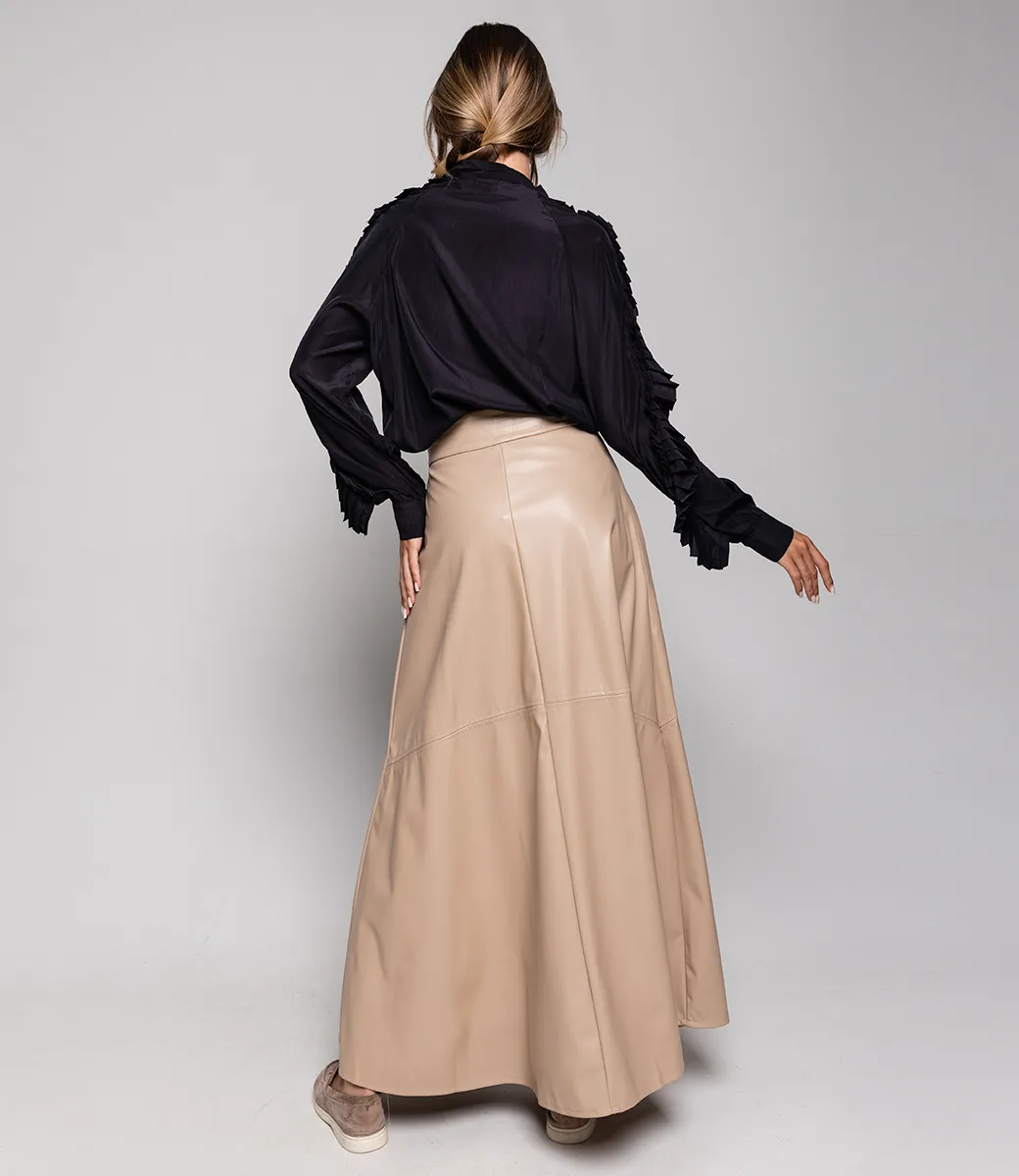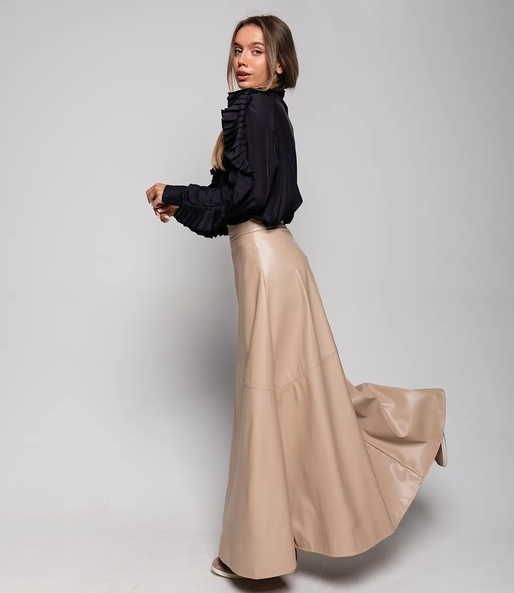 Юбка из эко-кожи длинны макси сделает образ ярким и при этом комфортным.