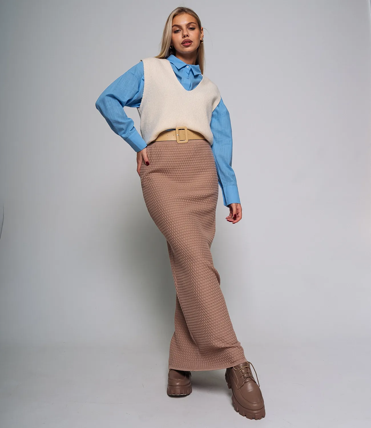 Трикотажная юбка длинного кроя с оригинальной вязкой и ремнем будет отличным дополнением к любому образу. Хлопок, Полиэстер