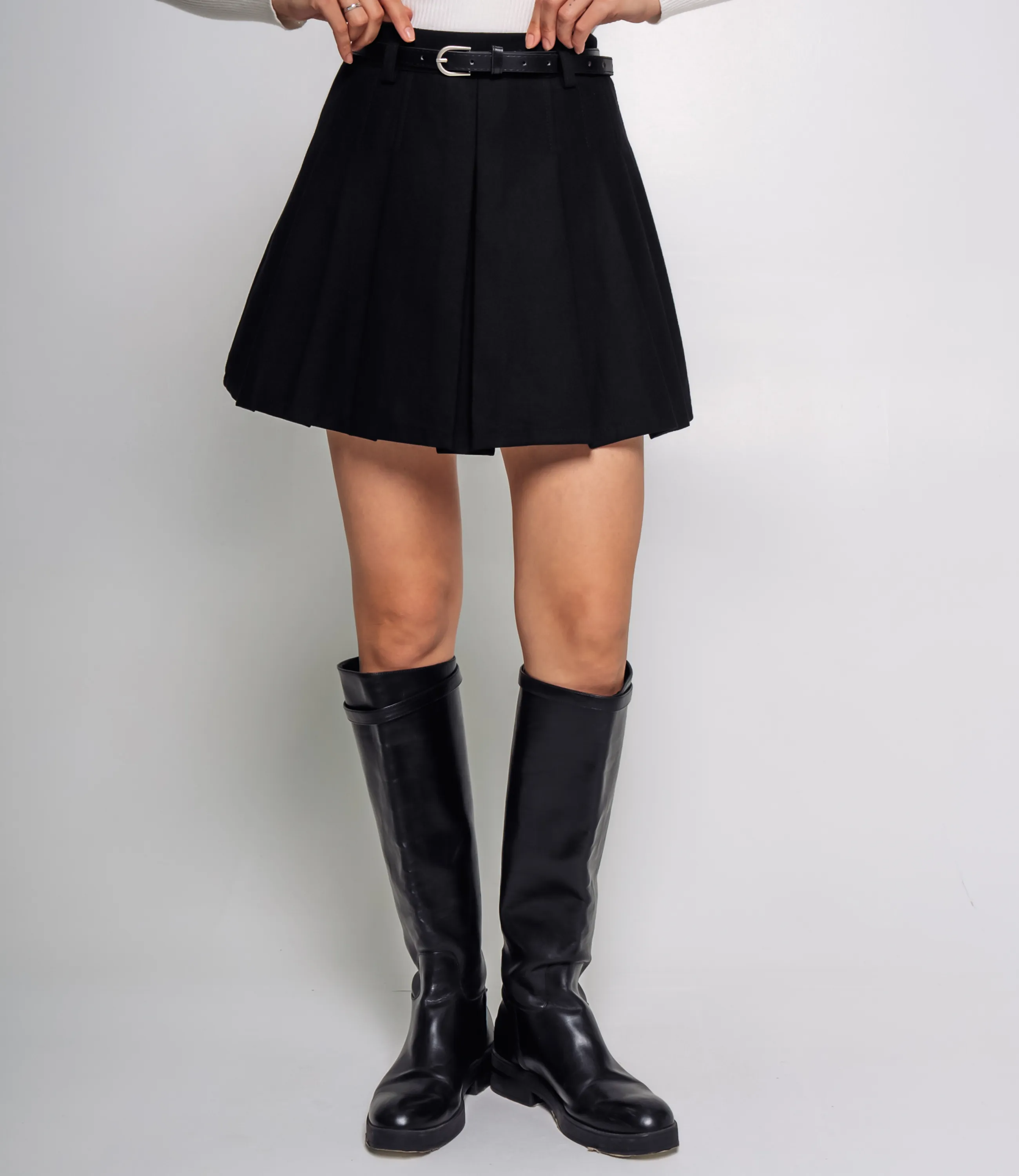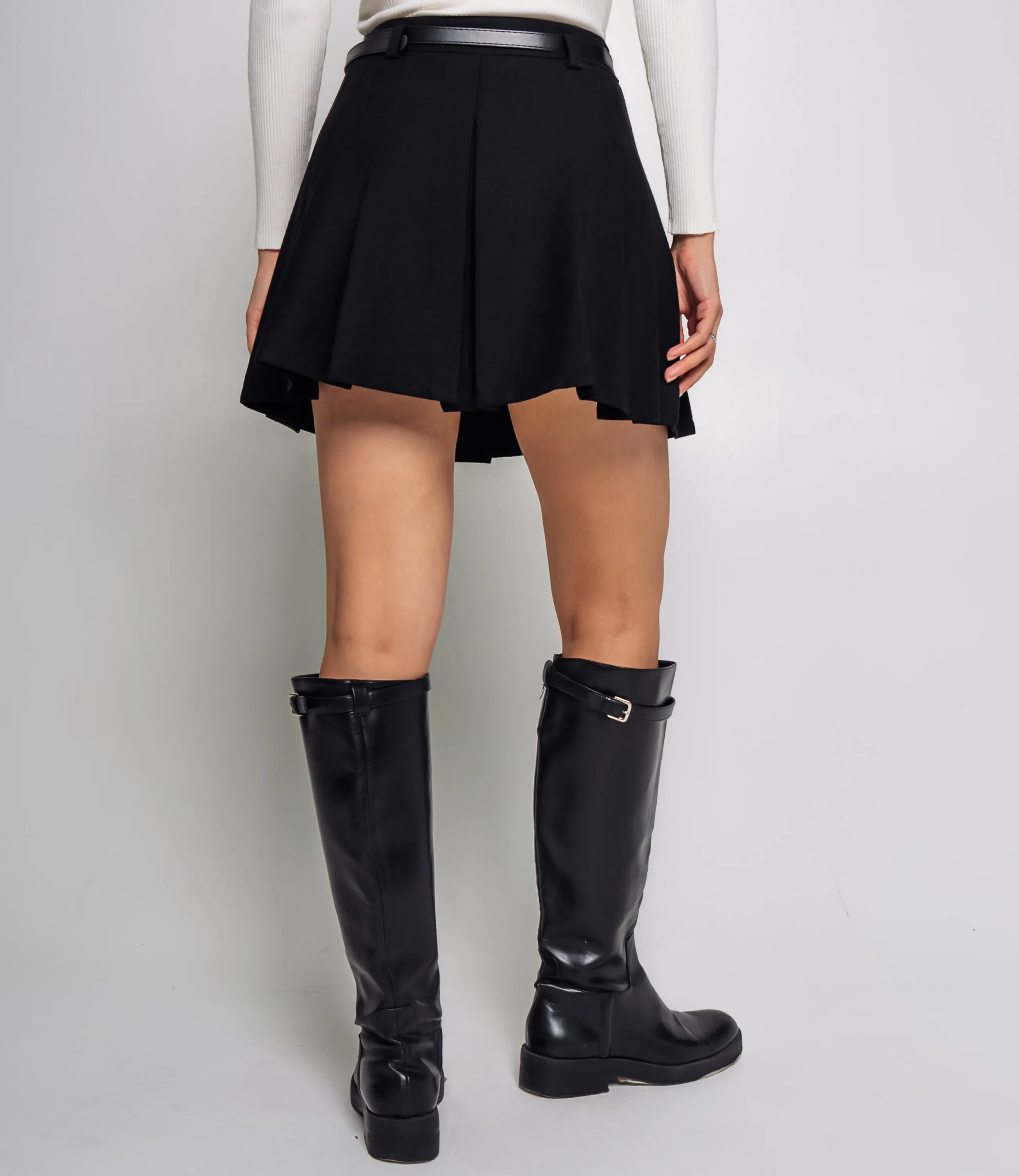 Эта юбка — идеальный элемент гардероба, который привлечет внимание ваших покупателей и добавит изысканности в их образы. Для изготовления юбки использованы качественные материалы: 65% хлопок и 35% полиэстер, что гарантирует долговечность и отличное состояние даже после многочисленных стирок. Короткая юбка с трапециевидным, слегка расклешённым силуэтом, сидящая на талии и подчёркнутая узким стачным поясом с петлями для ремня и тонким ремнём с овальной металлической пряжкой; передняя часть украшена центральной прокладной складкой, а по всему кругу расположены равномерные крупные складки, придающие объём и чёткую структуру, без видимых карманов и декоративных швов. Рост модели 164, 83-61-89. Вы можете заказать онлайн презентацию на интересующие Вас модели. Наши менеджеры свяжутся с Вами и проведут индивидуальную видеотрансляцию, помогут составить заказ и ответят на Ваши вопросы.