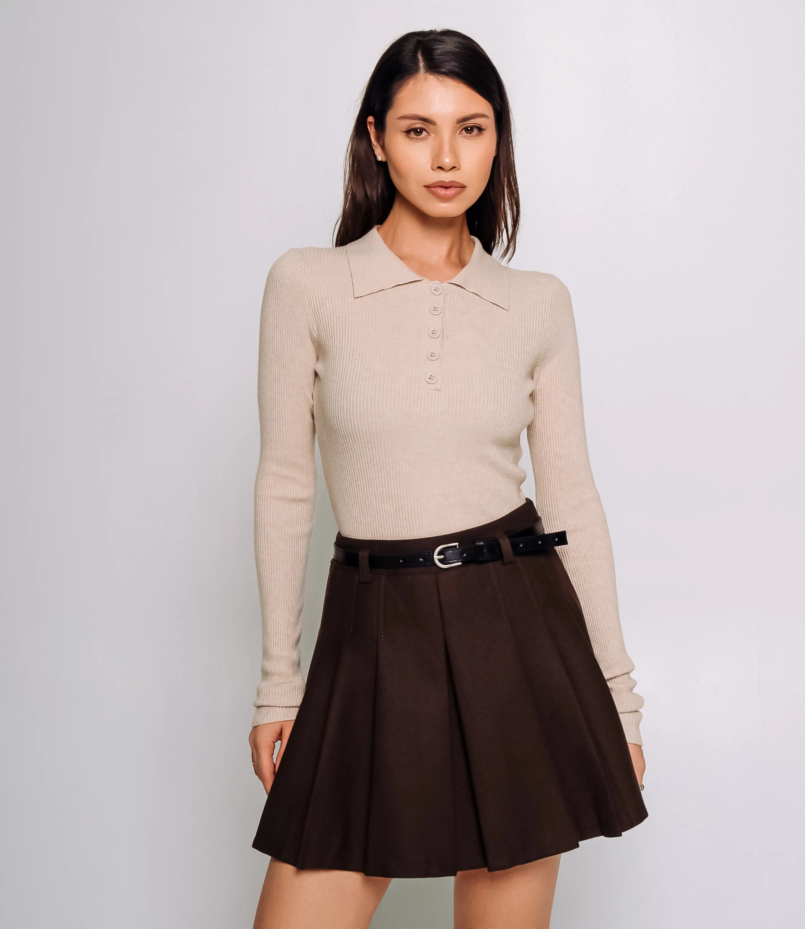 Эта юбка — идеальный элемент гардероба, который привлечет внимание ваших покупателей и добавит изысканности в их образы. Для изготовления юбки использованы качественные материалы: 65% хлопок и 35% полиэстер, что гарантирует долговечность и отличное состояние даже после многочисленных стирок. Короткая юбка с трапециевидным, слегка расклешённым силуэтом, сидящая на талии и подчёркнутая узким стачным поясом с петлями для ремня и тонким ремнём с овальной металлической пряжкой; передняя часть украшена центральной прокладной складкой, а по всему кругу расположены равномерные крупные складки, придающие объём и чёткую структуру, без видимых карманов и декоративных швов. Рост модели 164, 83-61-89. Вы можете заказать онлайн презентацию на интересующие Вас модели. Наши менеджеры свяжутся с Вами и проведут индивидуальную видеотрансляцию, помогут составить заказ и ответят на Ваши вопросы.