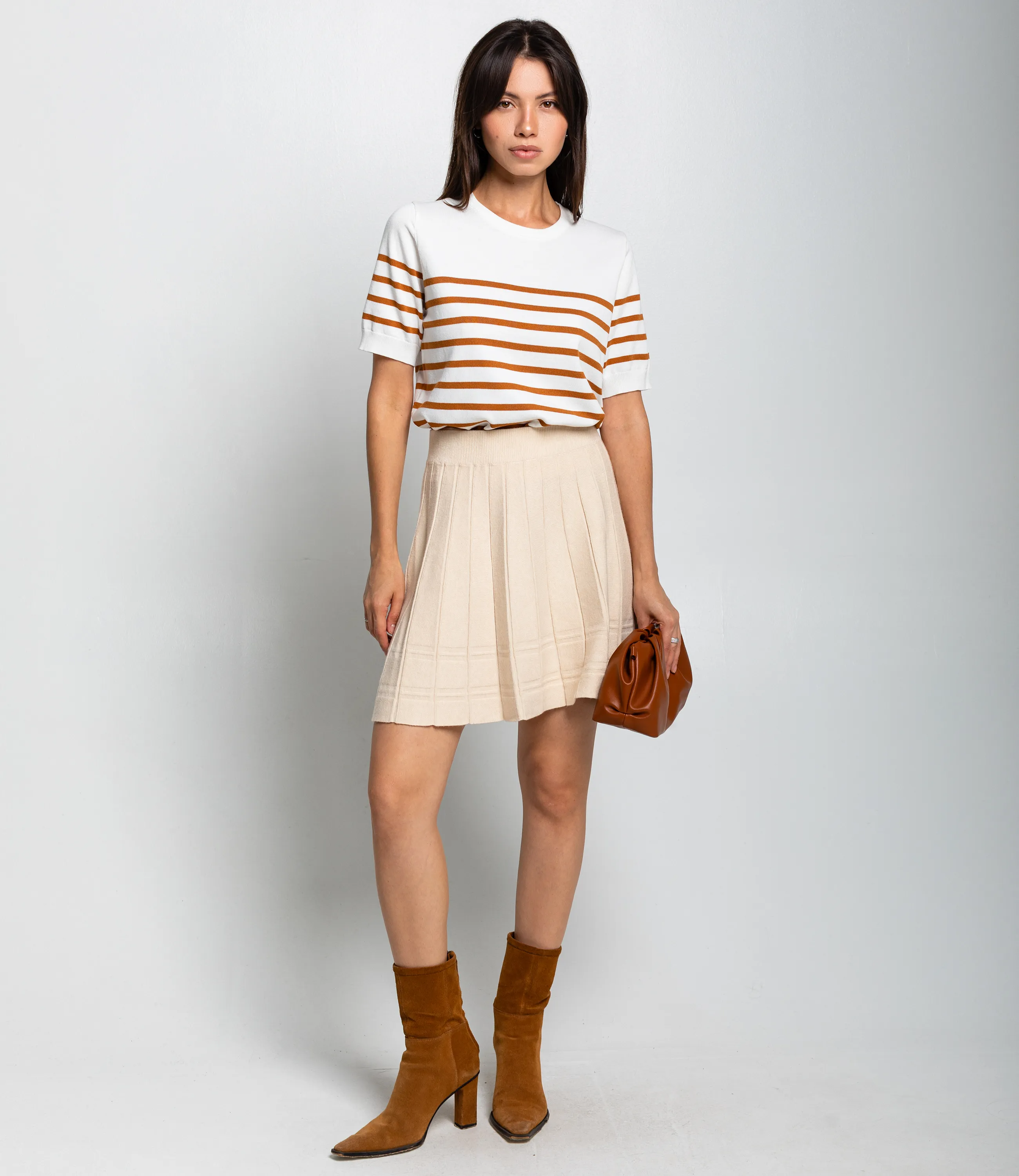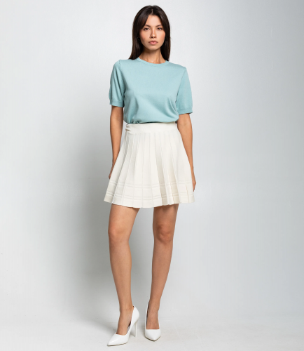 Эта юбка — идеальный элемент гардероба, который привлечет внимание ваших покупателей и добавит изысканности в их образы. Выполненная из 50% вискоза, 30% полиэстер и 20% нейлон. Фасон — расклешённая мини со складками‑плиссе: узкие вертикальные заложенные складки идут по всей длине, при этом внизу заметна более широкая декоративная полосная отделка, создающая лёгкую графичность подола. Талия высокая. Силуэт подчёркивает талию и визуально удлиняет ноги за счёт мини‑длины и расклёшенности. Стиль универсальный: хорошо сочетается с тонкими водолазкой. Качество исполнения и современный дизайн делают эту юбку желанным элементом гардероба для девушек, которые ценят стиль и комфорт. На странице сайта представлена таблица размеров, что упростит покупку для клиентов, помогая им выбрать идеальный размер без лишних трудностей. Установленная цена делает эту юбку доступной, что способствует её популярности среди покупателей. Рост модели 164 см., 83-61-89. Вы можете заказать онлайн презентацию на интересующие Вас модели. Наши менеджеры свяжутся с Вами и проведут индивидуальную видеотрансляцию, помогут составить заказ и ответят на Ваши вопросы.
