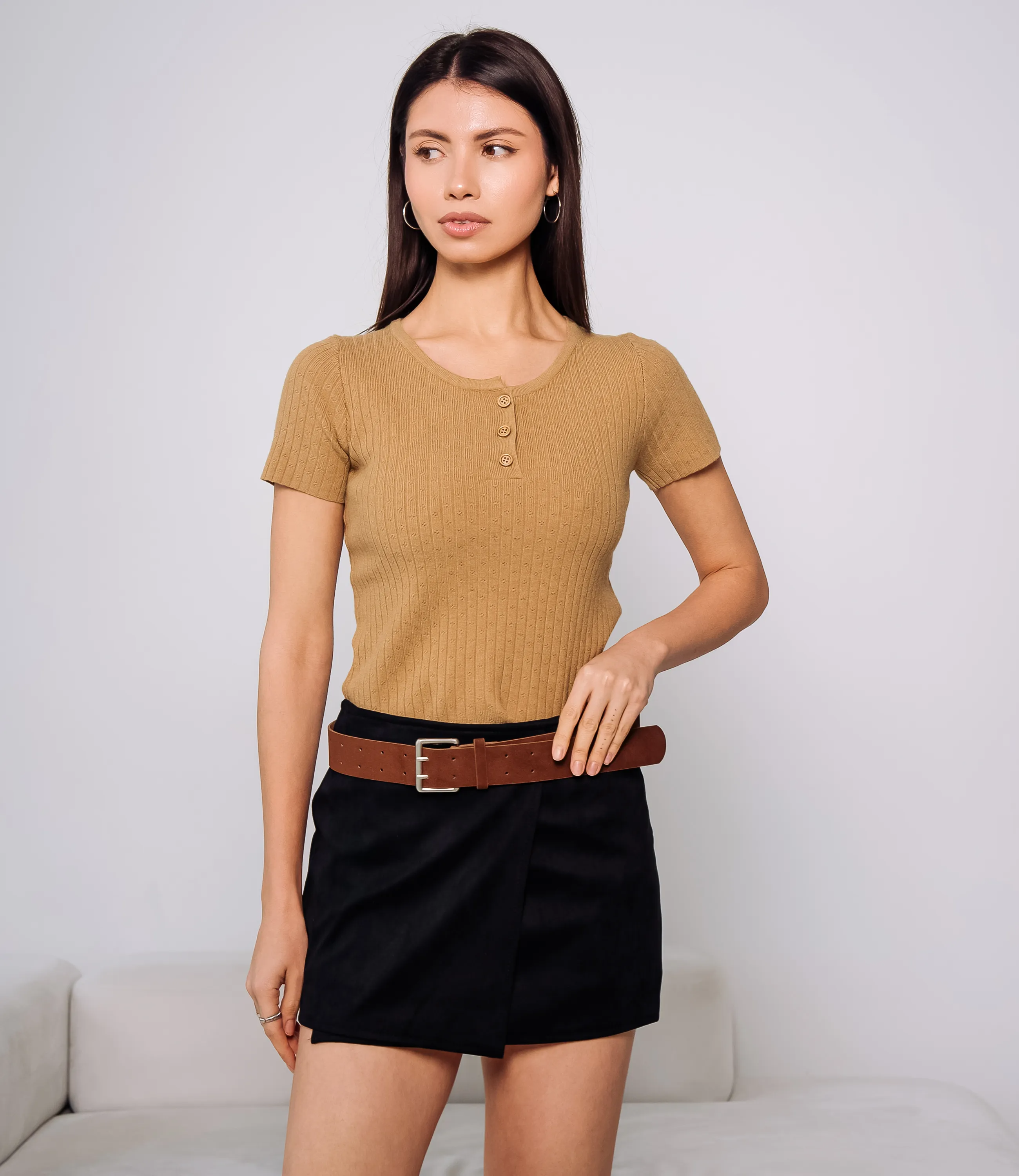 Юбка — это часть гардероба, которая подчёркивает женственность и привлекательность любой женщины. Юбка короткой мини-длины, прямого кроя, украшенная широким поясом с пряжкой; передняя деталь имитирует запах с прямой контурной линией, швы аккуратно прострочены, низ обработан ровным подгибом. Юбка с запахом. Для пошива использован материал: 100% полиэстер. Такая ткань отличается прочностью, лёгкостью и простотой в уходе; она хорошо держит форму и сохраняет презентабельный вид даже после многократных стирок при соблюдении рекомендаций по уходу. Цвета глубокие и насыщенные, полностью соответствуют фотографиям на странице, что важно при комплектовании витрин и формировании коллекций. На сайте представлена таблица размеров — с её помощью вы сможете самостоятельно снять мерки и подобрать подходящие размеры для ваших покупательниц. Для оптовых покупателей мы предлагаем выгодные условия сотрудничества, гибкую ценовую политику и надёжные поставки для магазинов. Установленная цена адекватна и позволит вам формировать привлекательную наценку и обеспечивать высокую оборотность. Предложите своим клиенткам юбку, сочетающую стиль, удобство и простоту ухода. Рост модели 164 см., 83-61-89.