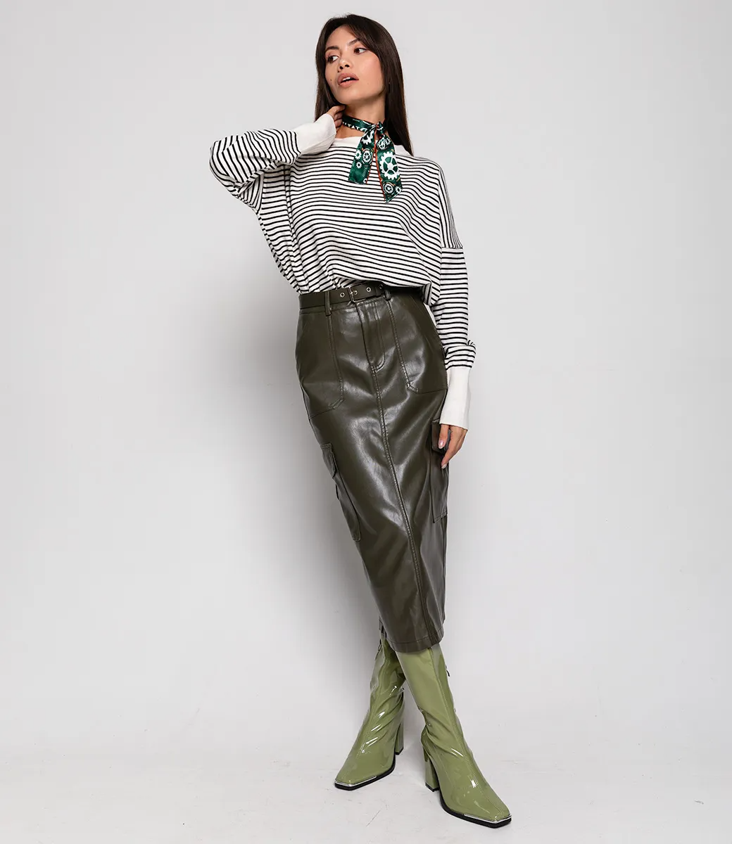 Юбка из эко-кожи с ремнем и небольшим разрезом сзади сделает образ более дерзким и притягательным. Полиуретан