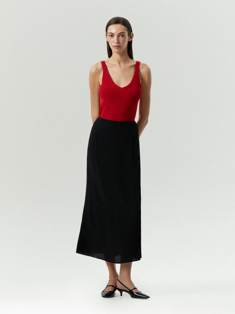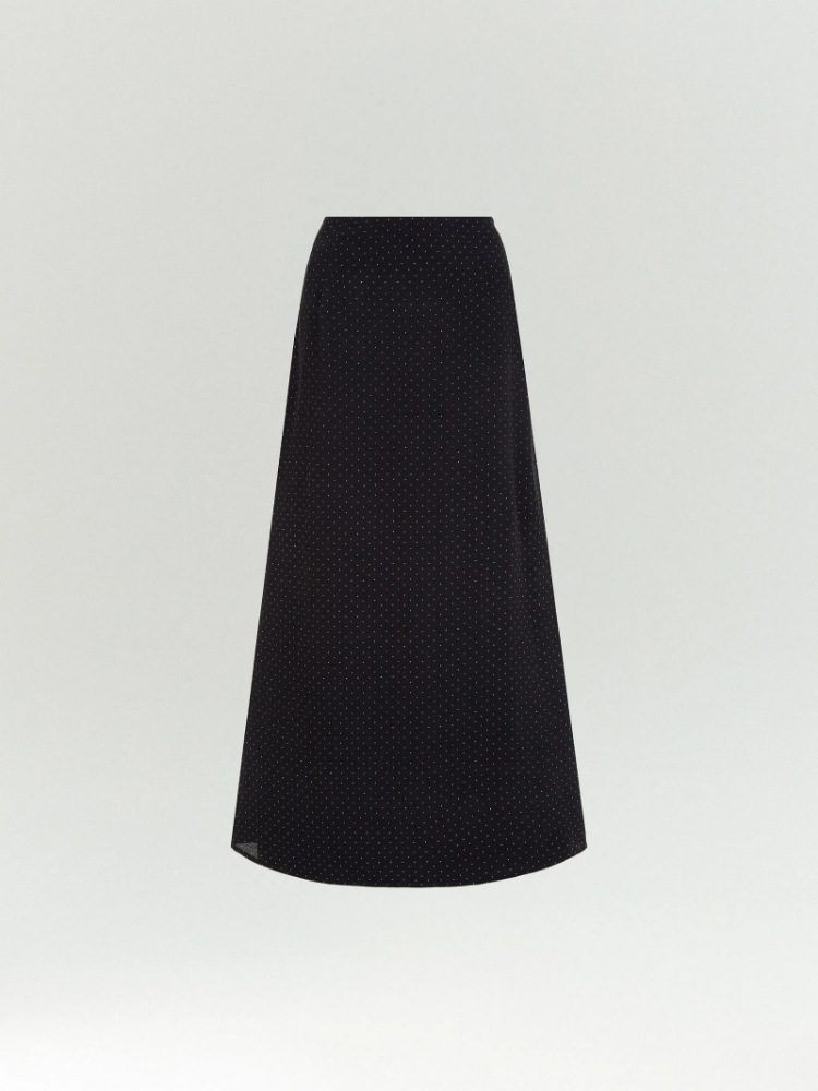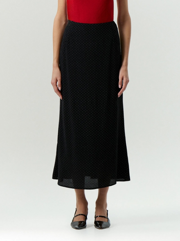 Лёгкая юбка в горох из вискозы. Выполнена на непросвечивающей подкладке. Модель А-силуэта в длине миди имеет высокую посадку. Застёгивается на молнию сзади. Юбка подойдёт для создания модных повседневных образов. Дополнить её можно белым трикотажным или атласным топом и другими элементами базового гардероба