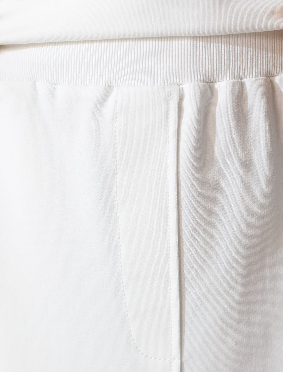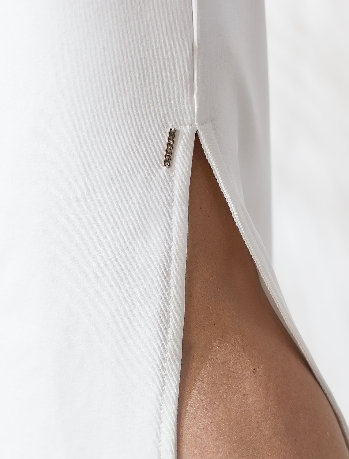 Юбка миди белого цвета выполнена из футера двухнитки с эластаном плотностью 240 Г/м2. Плотная структура материала отлично держит форму, не вытягивается и обеспечивает оптимальный теплообмен. В этой юбке из нежного и тактильно приятного трикотажа не жарко летом и уютно в весенннюю погоду. Гладкая лицевая сторона придает юбке опрятный и дорогой вид. Универсальная длина миди визуально вытягивает силуэт, делает образ более сдержанным и подходит на низкий и высокий рост. Эластичный широкий пояс на резинке мягко фиксирует юбку на талии, обеспечивая идеальную посадку на любую фигуру, в том числе большие размеры, включая 56. Боковые карманы добавляют функциональности и подчеркивают расслабленный характер повседневной юбки, а разрезы по бокам добавляют образу динамики и легкости. Спортивная юбка средней длины позволяет чувствовать себя максимально расслабленно, при этом сохраняя изящный женственный образ. Поможет при создании стиля casual и подойдет для более утонченного лука.
