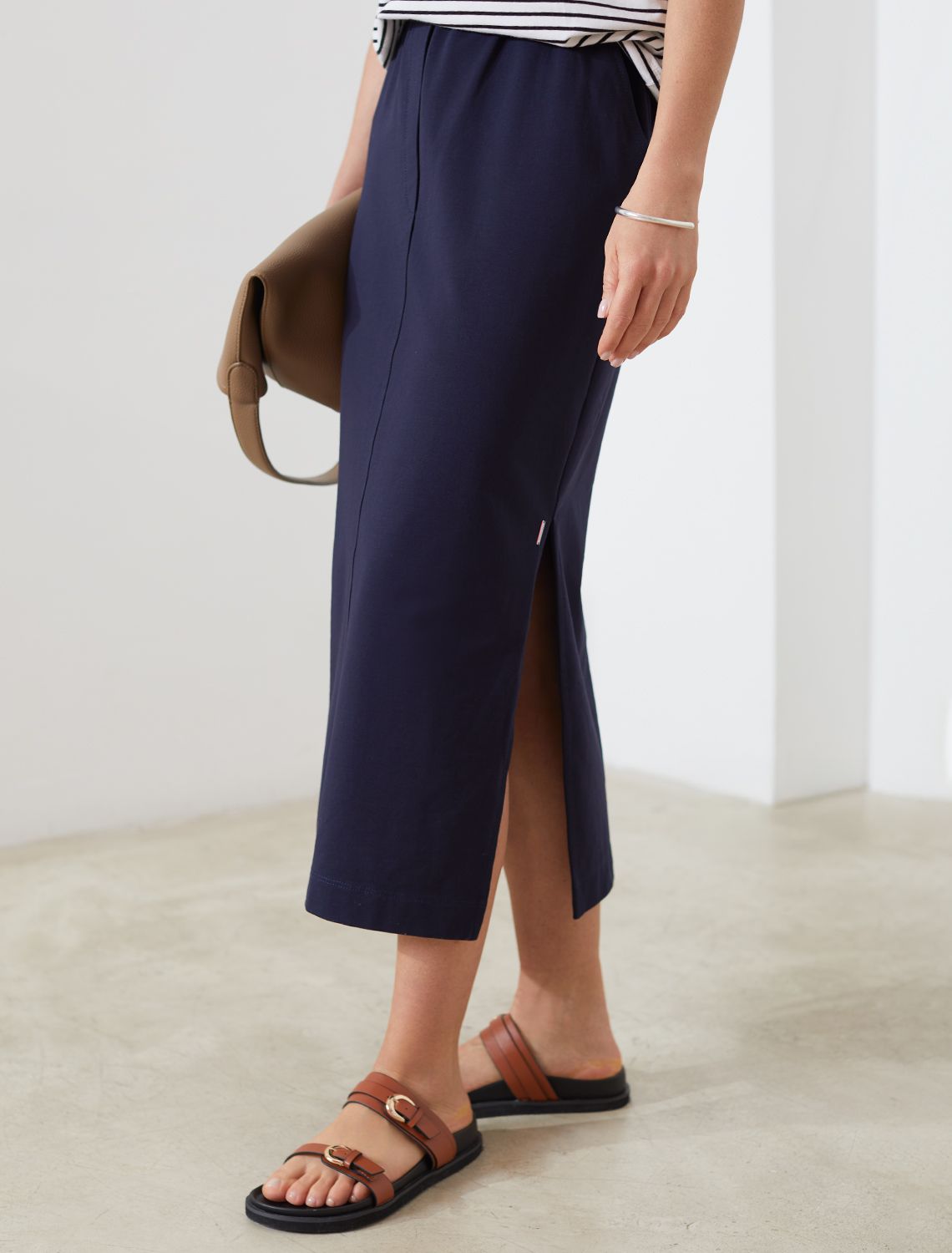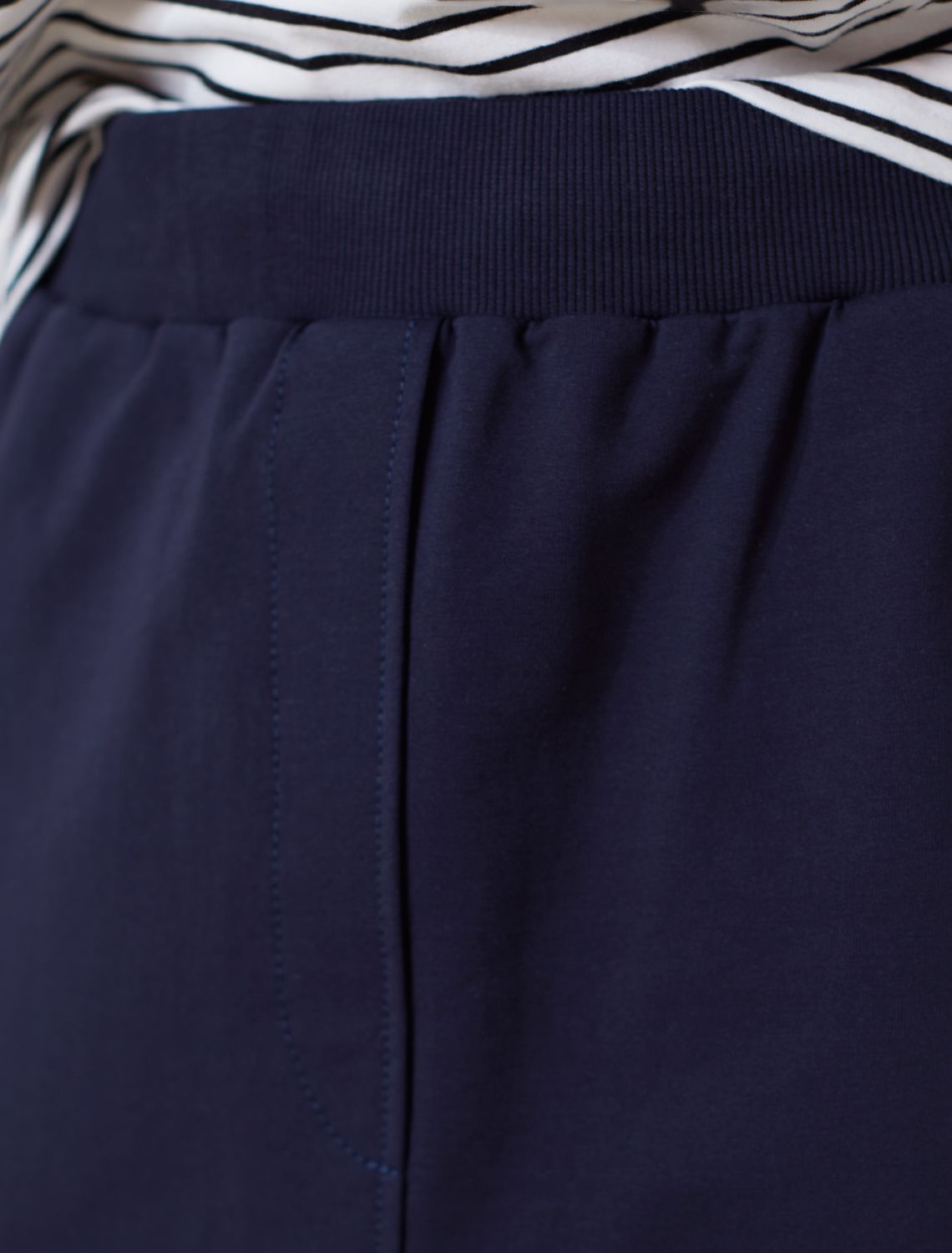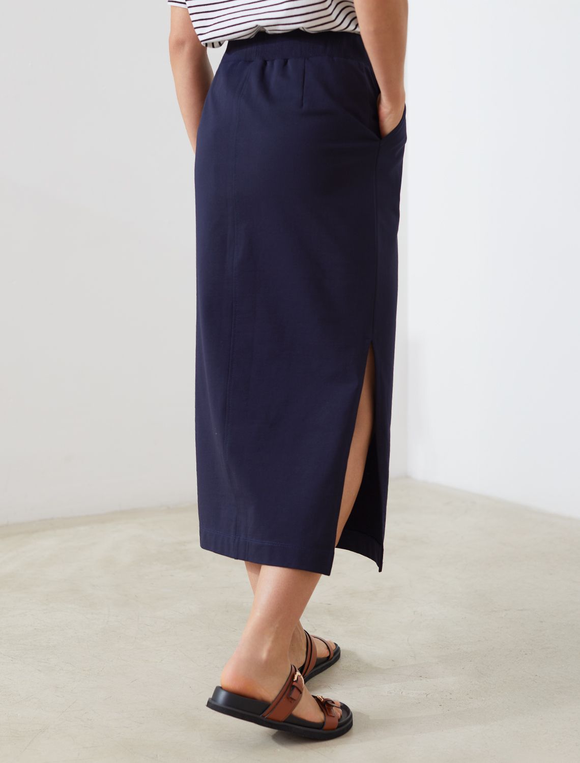 Юбка миди темно-синего цвета выполнена из футера двухнитки с эластаном плотностью 240 Г/м2. Плотная структура материала отлично держит форму, не вытягивается и обеспечивает оптимальный теплообмен. В этой юбке из нежного и тактильно приятного трикотажа не жарко летом и уютно в весенннюю погоду. Гладкая лицевая сторона придает юбке опрятный и дорогой вид. Универсальная длина миди визуально вытягивает силуэт, делает образ более сдержанным и подходит на низкий и высокий рост. Эластичный широкий пояс на резинке мягко фиксирует юбку на талии, обеспечивая идеальную посадку на любую фигуру, в том числе большие размеры, включая 56. Боковые карманы добавляют функциональности и подчеркивают расслабленный характер повседневной юбки, а разрезы по бокам добавляют образу динамики и легкости. Спортивная юбка средней длины позволяет чувствовать себя максимально расслабленно, при этом сохраняя изящный женственный образ. Поможет при создании стиля casual и подойдет для более утонченного лука.