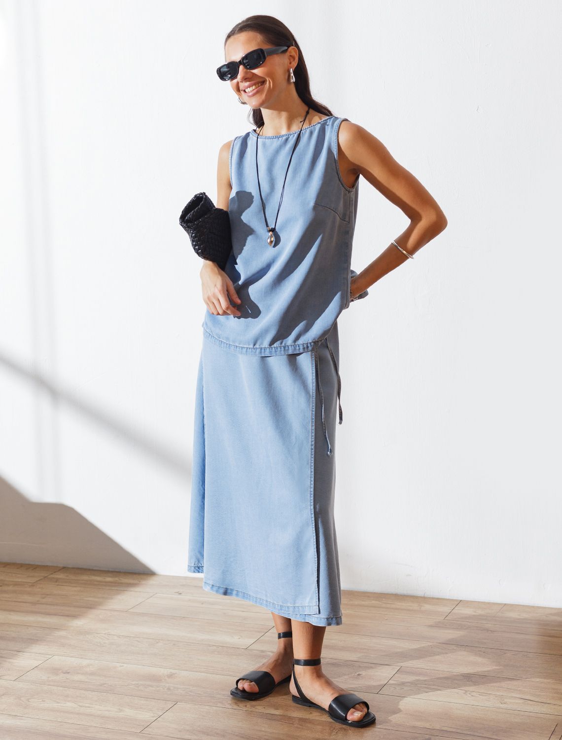 Эффектная юбка миди на запах А-силуэта светло-голубого цвета из джинсового лиоцелла плотностью 7,8 OZ станет отличным выбором для тех, кто ценит комфорт и легкость в повседневной одежде. Свободный крой юбки мягко скроет недостатки фигуры, акцентируя внимание на достоинствах и придавая силуэту привлекательность и женственность. ЗапАх гарантирует удобство и возможность регулировки объема талии, а также добавляет современный акцент. Легкая и удобная, она подарит ощущение свободы движений. Ткань сочетает прочность и мягкость лиоцелла с вискозой, что делает её невероятно комфортной, дышащей, устойчивой к сминанию и идеально подходящей для чувствительной кожи. Юбка отлично подходит для создания легких летних образов или стильных ансамблей на каждый день. Джинсовую юбку можно сочетать в стиле кэжуал, а также создавать романтичные образы или добавлять яркие акценты с помощью аксессуаров. Юбка средней длины гармонично сочетается с разной обувью и верхом, что делает ее отличным выбором для любого случая.
