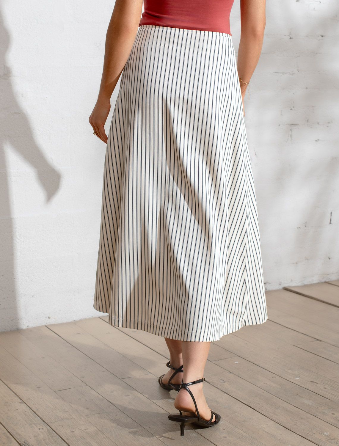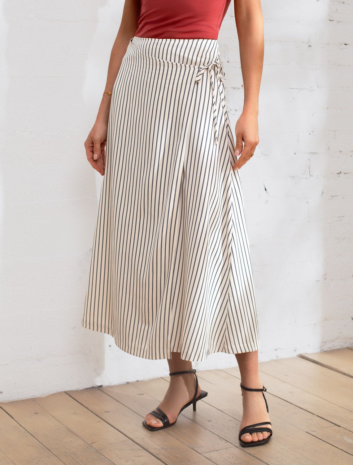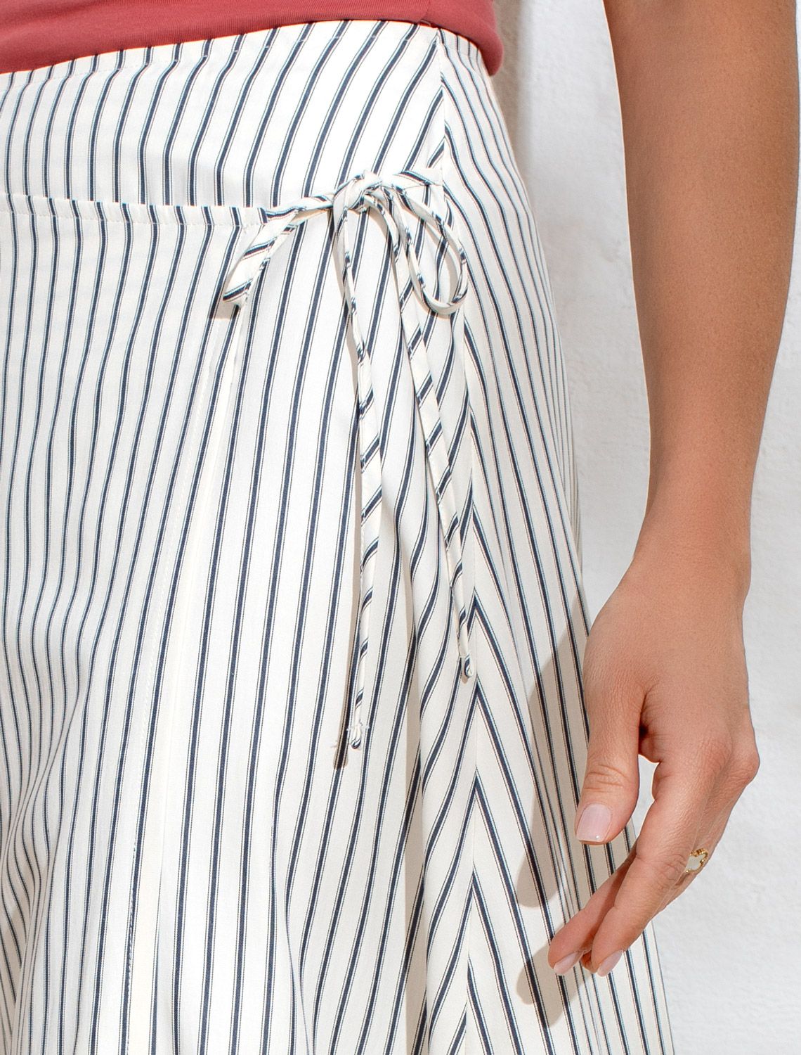 Юбка А-силуэта на запАх молочно-синего цвета выполнена из легкого хлопкового поплина плотностью 112 Г/м2. Свободная юбка сидит идеально, позволяя легко двигаться в течение дня. Такая модель подходит на маленький и высокий рост, а так же на любую фигуру, позволяя подчеркнуть достоинства и скрыть возможные недостатки. Средняя длина подчеркивает красоту ног и делает образ элегантным, универсальным для любого случая. Классическая юбка в тонкую полоску создает идеальный силуэт, визуально вытягивает и стройнит фигуру. Принт добавляет динамики и оригинальности даже самым лаконичным комплектам, делая этот предмет гардероба настоящим хитом сезона. Натуральный состав ткани обладает высокой воздухопроницаемостью, а также способностью поглощать и отдавать влагу. В повседневной юбке будет очень комфортно, благодаря правильной регуляции температуры тела. Стильная юбка отлично сочетается с монохромным верхом для вытягивания силуэта или контрастными цветами. С этой красивой юбкой можно создавать эффектные наряды как на выход, так и для ежедневных рабочих дел или простых прогулок.