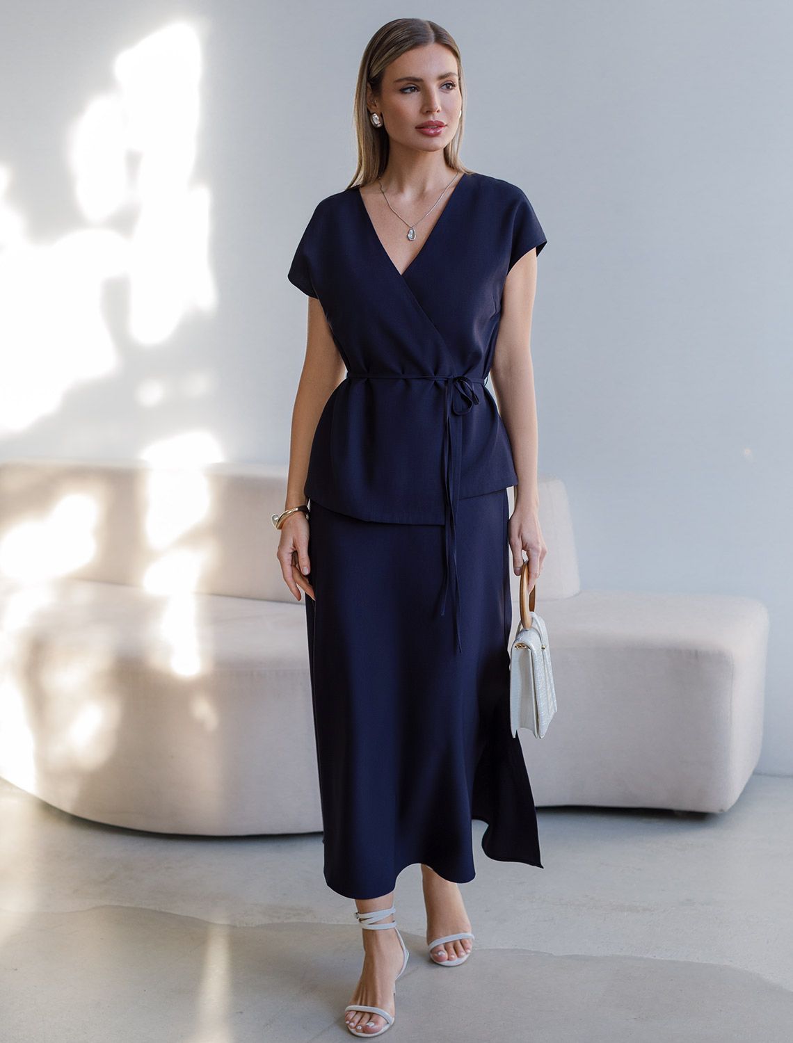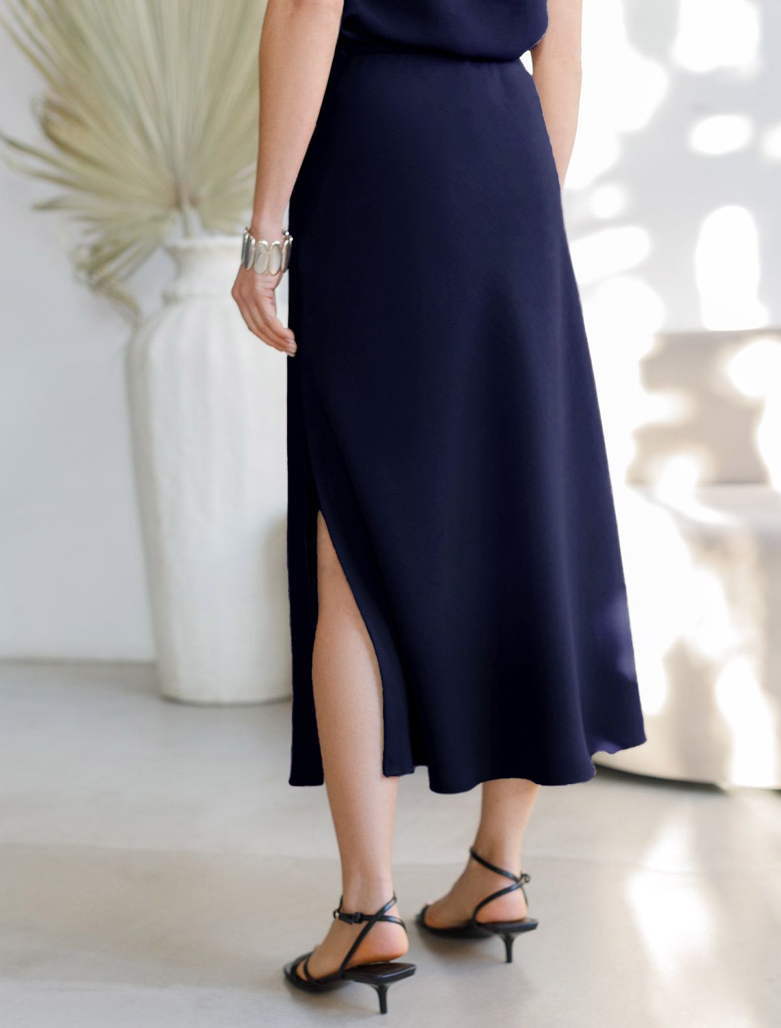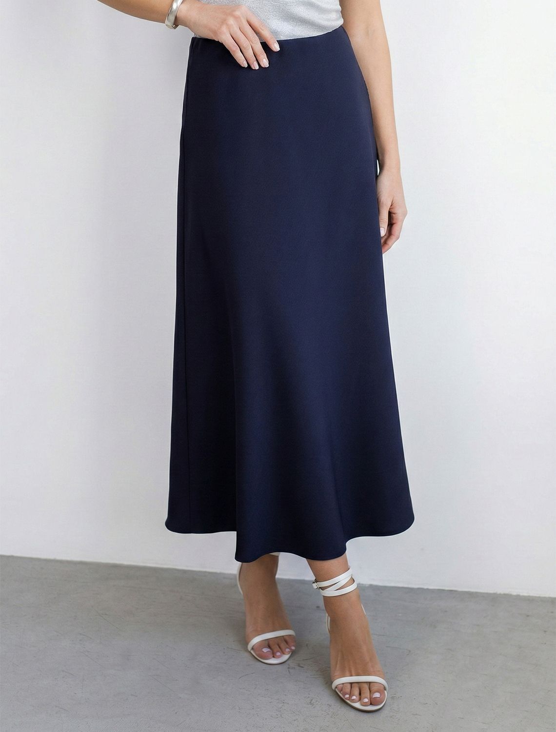 Юбка темно-синего цвета длины миди выполнена из плотного лиоцелла. Модель, скроенная по косой, мягко струится по телу и отлично драпируется. Лиоцелл это более дорогой и экологичный вариант вискозы, очень прочный и шелковистый. Ткань отличается от регулярной коллекции из лиоцелла - она содержит еще больше лиоцелла (92%), благодаря чему имеет более нежную шелковистую фактуру. Свободный крой юбки мягко скроет недостатки фигуры, акцентируя внимание на достоинствах и придавая силуэту привлекательность и женственность. Элегантная юбка на эластичном поясе гарантирует комфорт, а разрез с боку добавляет образу легкости и динамики. Расклешеная юбка подойдет на большие размеры, высокий и низкий рост. Юбка А силуэта будет базовым элементом для создания летних романтичных образов и стильных ансамблей на каждый день.