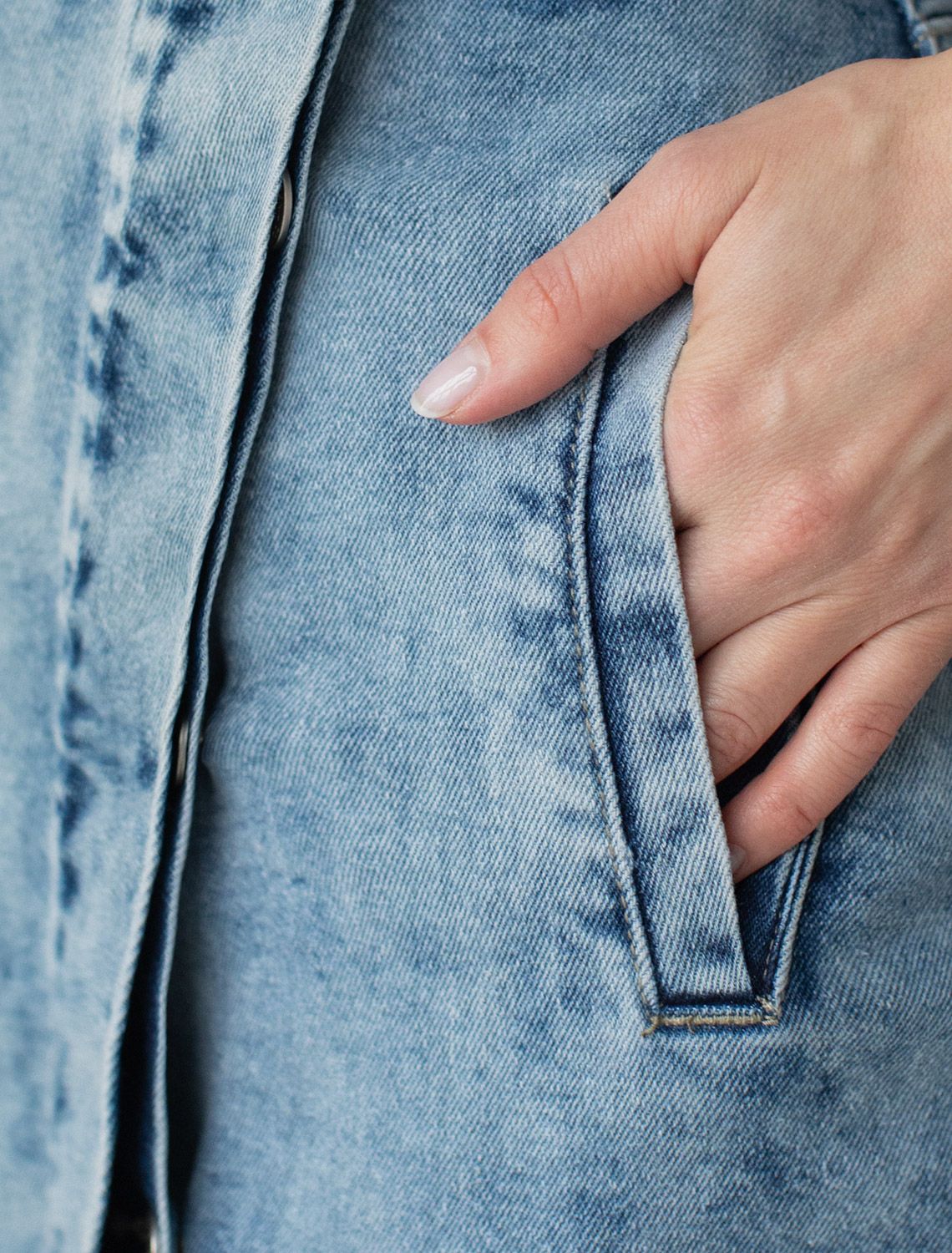 Юбка выполнена из эластичного денима с декоративными потертостями. Модель на запАх отлично сидит по фигуре, подчеркивая изгибы тела и изящно открывает ноги при ходьбе. Передние карманы как брюк. На поясе расположен брендированный патч.