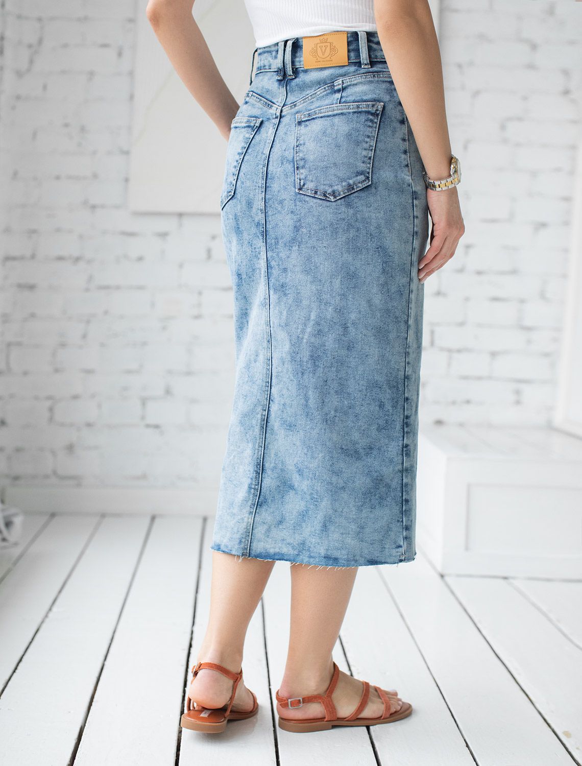 Юбка выполнена из эластичного денима с декоративными потертостями. Модель на запАх отлично сидит по фигуре, подчеркивая изгибы тела и изящно открывает ноги при ходьбе. Передние карманы как брюк. На поясе расположен брендированный патч.