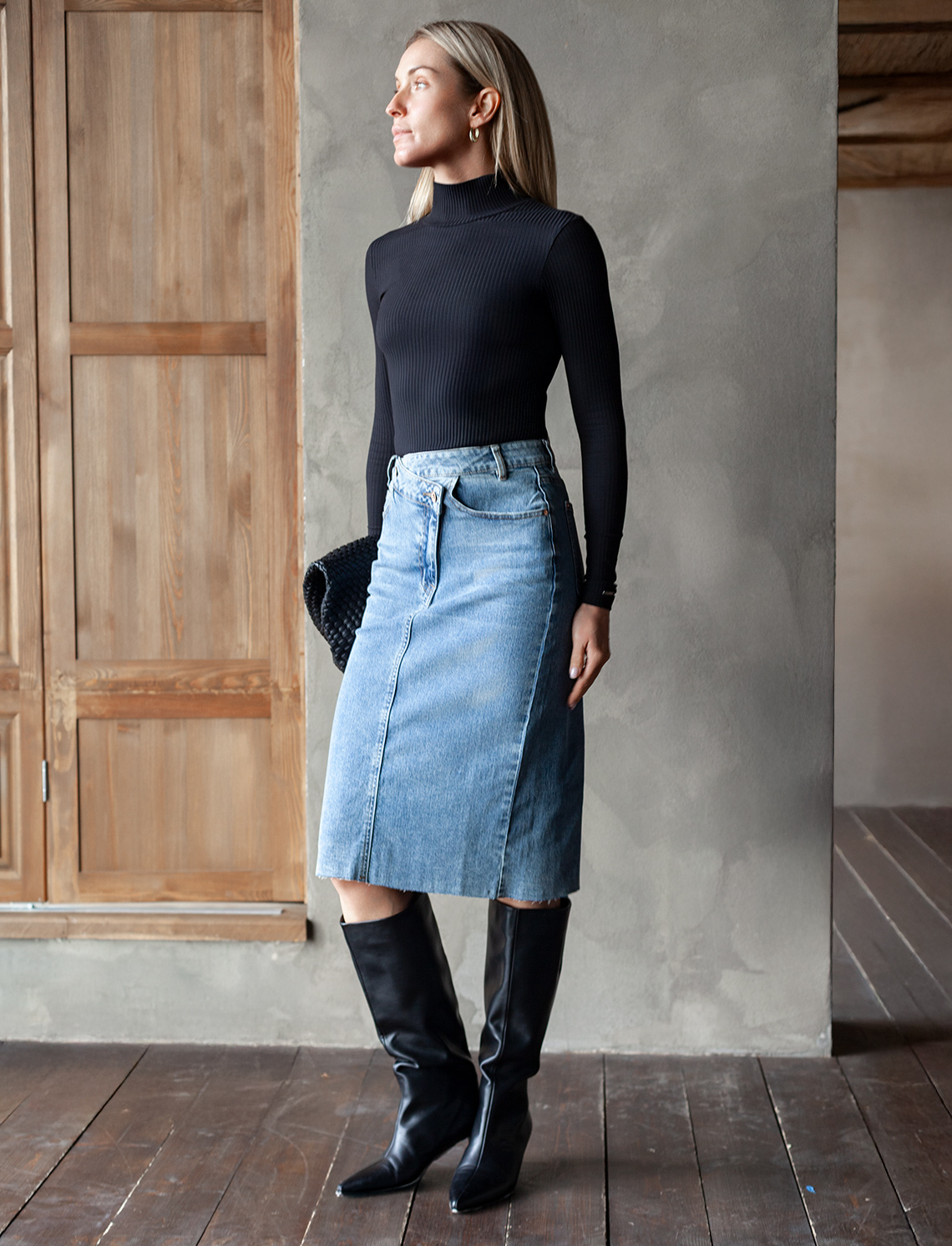 Юбка выполнена из эластичного денима. Модель с трендовой ассиметричной застежкой и декоративной стиркой дополнена краем с открытым срезом и потертостями. Изделие прямого кроя длиной чуть ниже колен с разрезом сзади дополнено брендированным патчем и высококачественной фурнитурой. синий