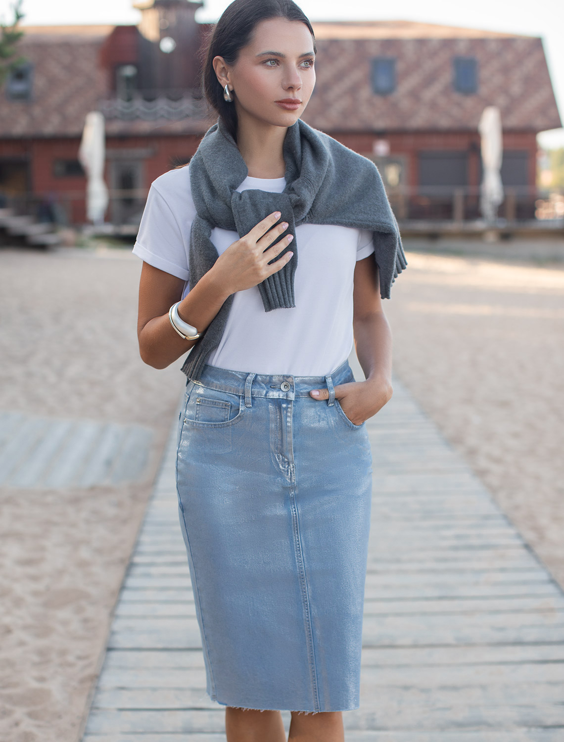 Юбка выполнена из эластичного денима. Сверху изделия нанесено стойкое, но при этом мягкое металлизированное покрытие с декоративными потёртостями. Модель прямого кроя чуть ниже колен с трендовым открытым срезом и пятью карманами как у джинс внесет яркий акцент любому образу. голубой-серебряный