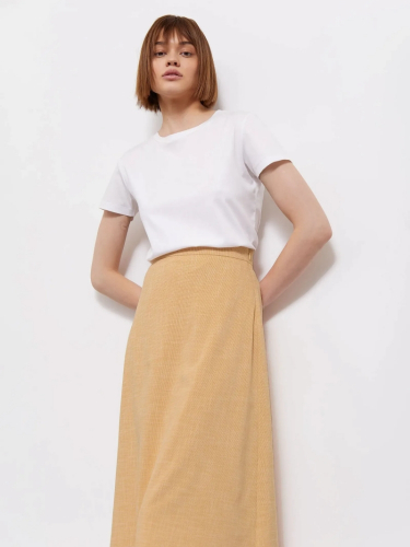 Юбка жёлтого цвета в мелкую гусиную лапку. Выполнена из фактурного материала с высоким содержанием вискозы, на подкладке. Модель А-силуэта в длине миди имеет высокую посадку. Сочетается с трикотажными футболками и топами, а также другими элементами базового гардероба